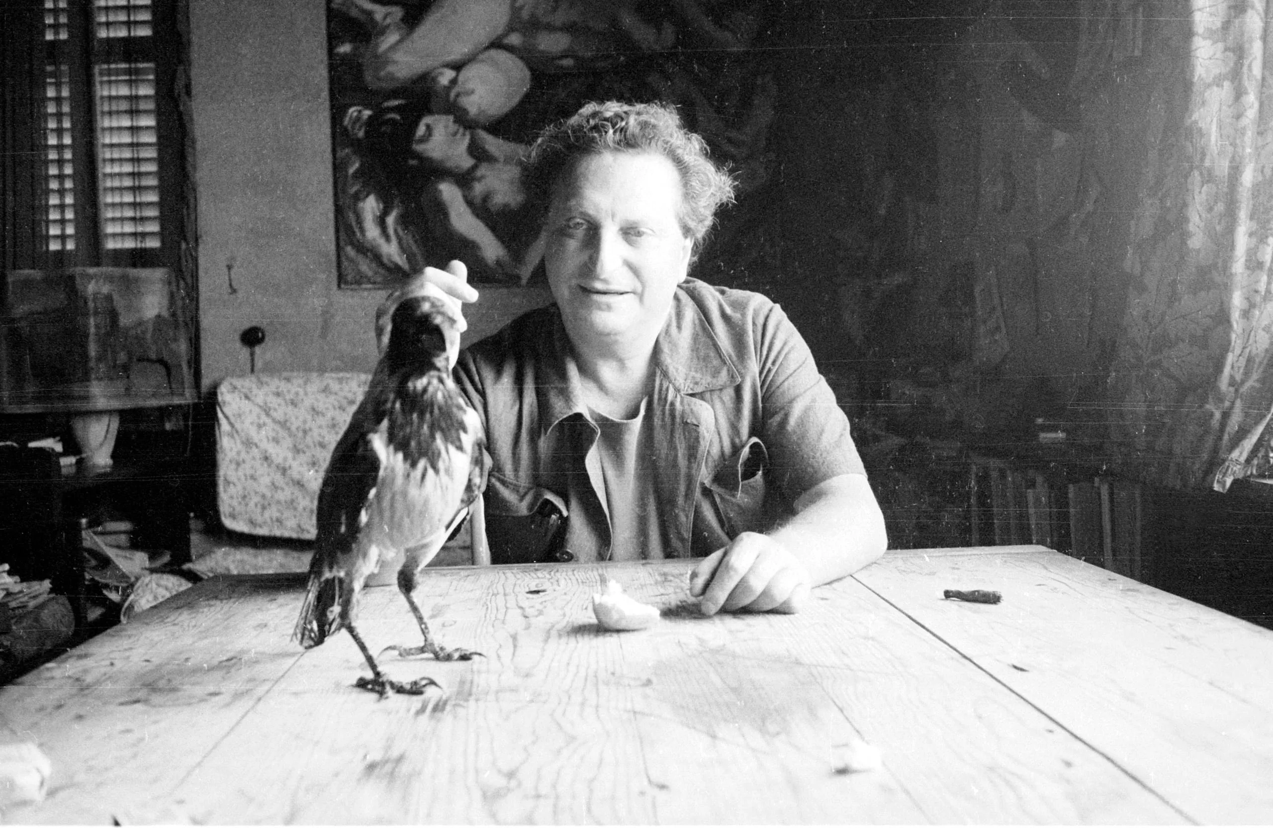 Black and white photograph of a curly-haired man sitting at a wooden table, extending his hand toward a magpie-like bird perched on the table, with a large painting visible on the wall behind him
