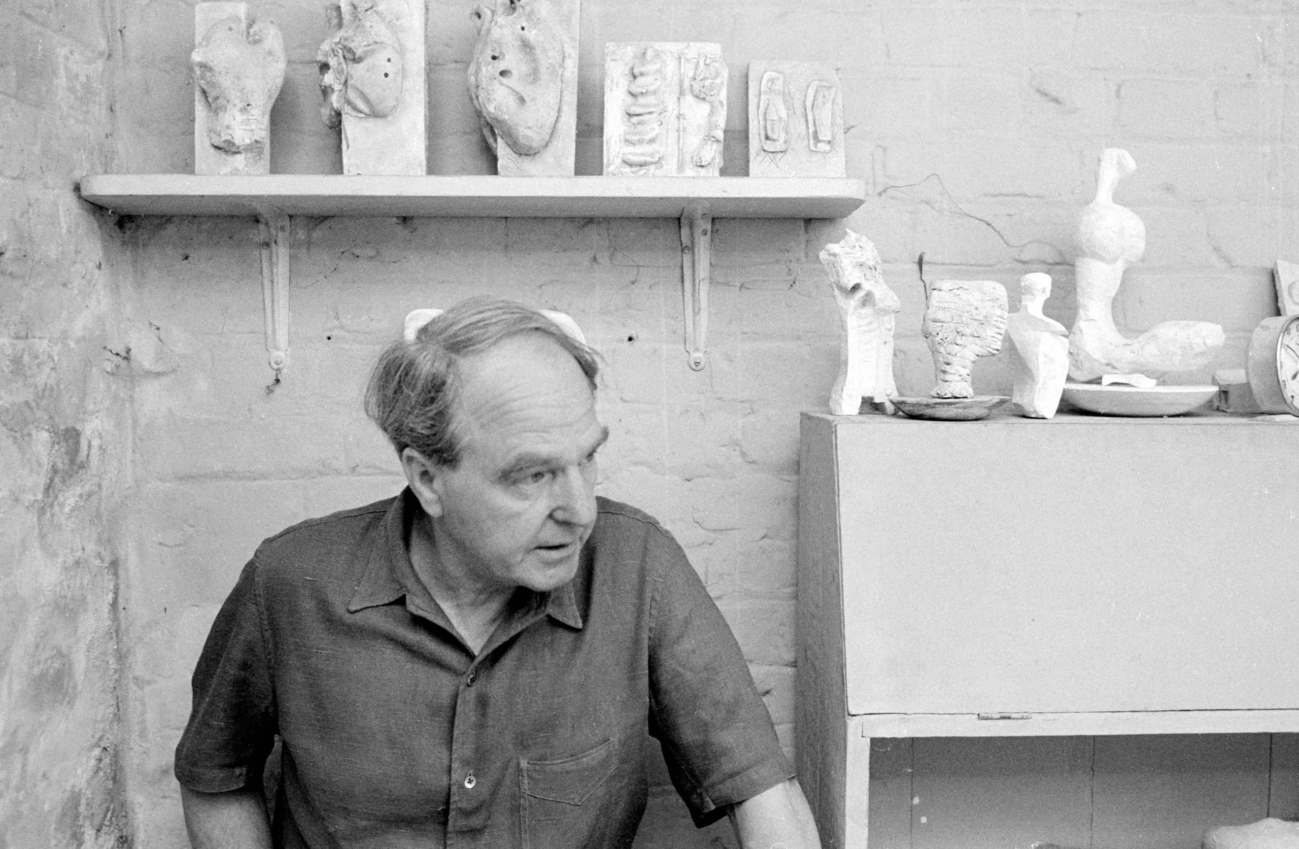 Black and white photograph of a white man from the chest up in a studio, with small plaster sculptures on a shelf and cabinet behind him
