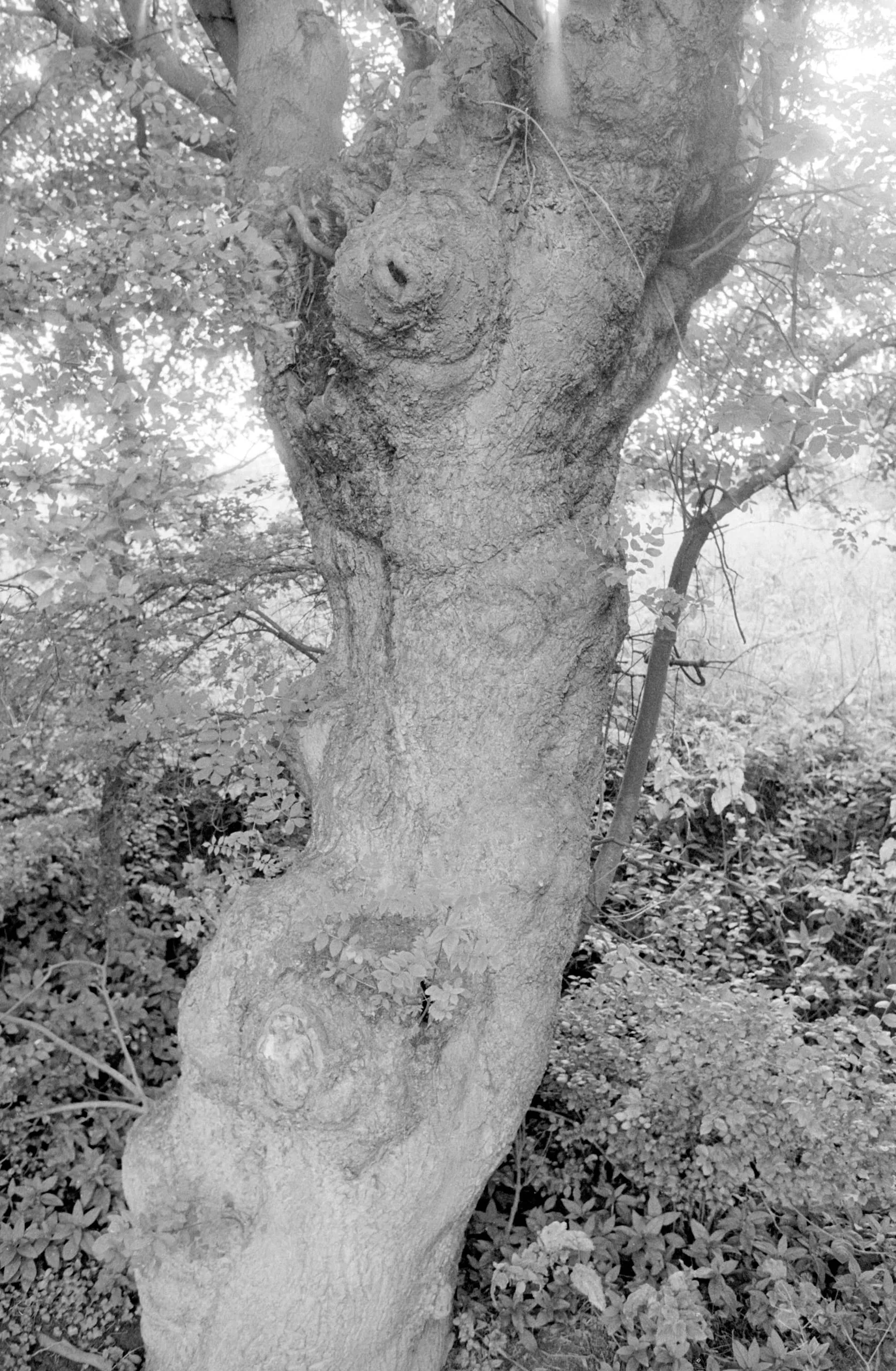 Black and white photograph of a large, gnarled tree trunk with prominent bark knots, surrounded by soft-focus foliage