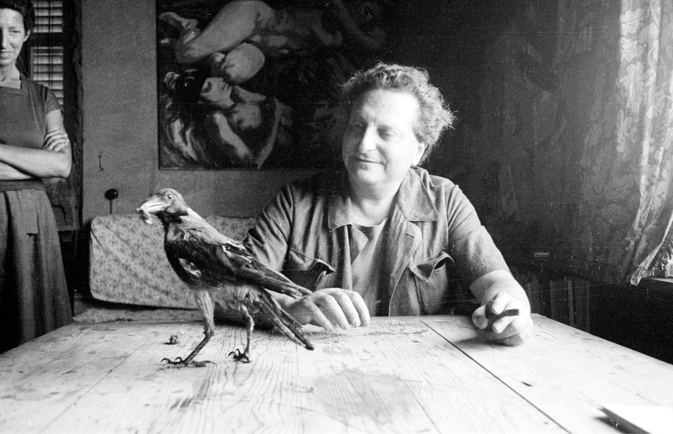 Black and white photograph of a curly-haired man seated at a wooden table, looking at a dark-feathered bird perched before him, woman standing in background