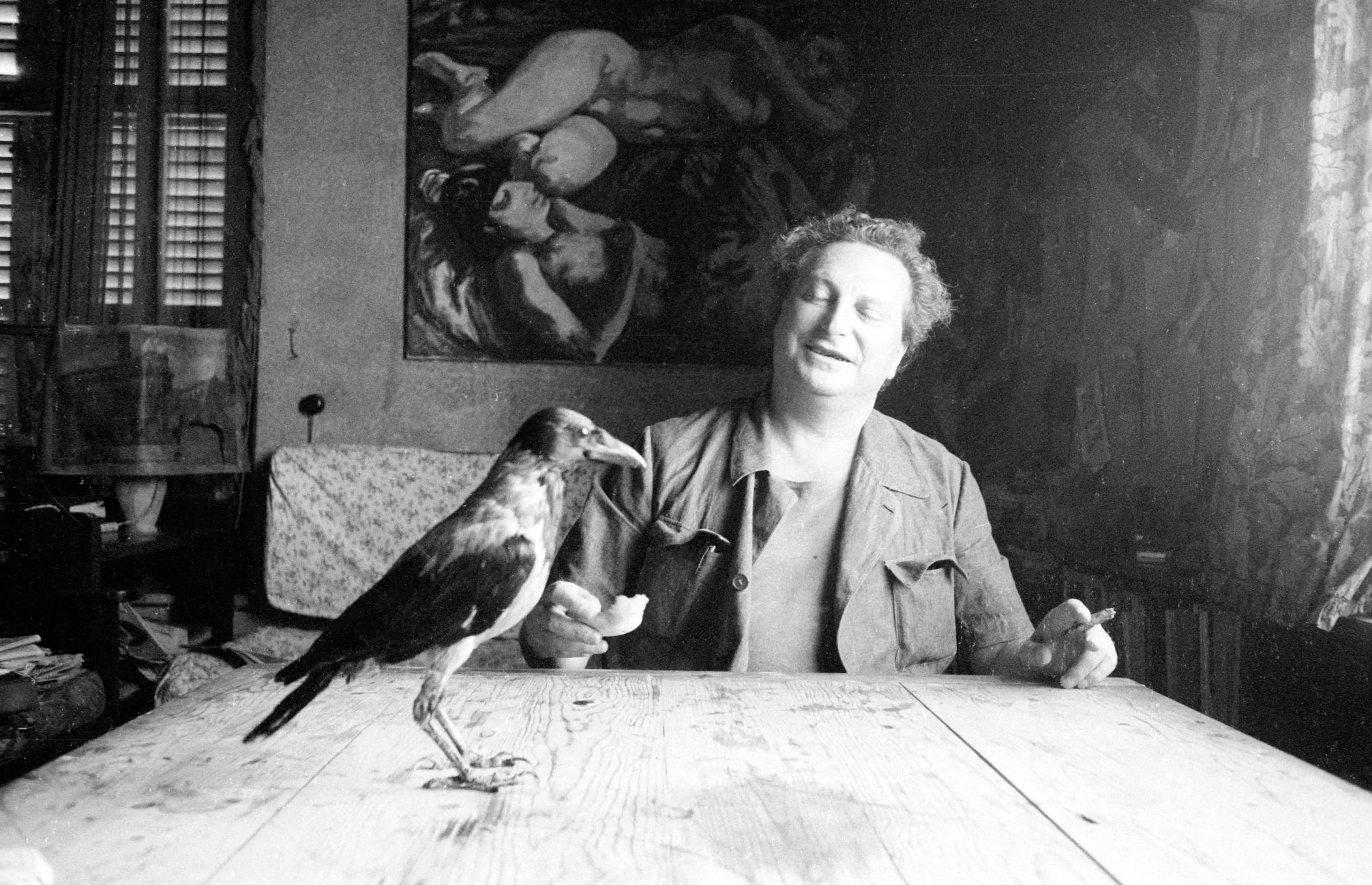 Black and white photograph of a laughing white man seated at a wooden table, offering food to a large crow or magpie standing on the table, with a large painting visible on the wall behind him