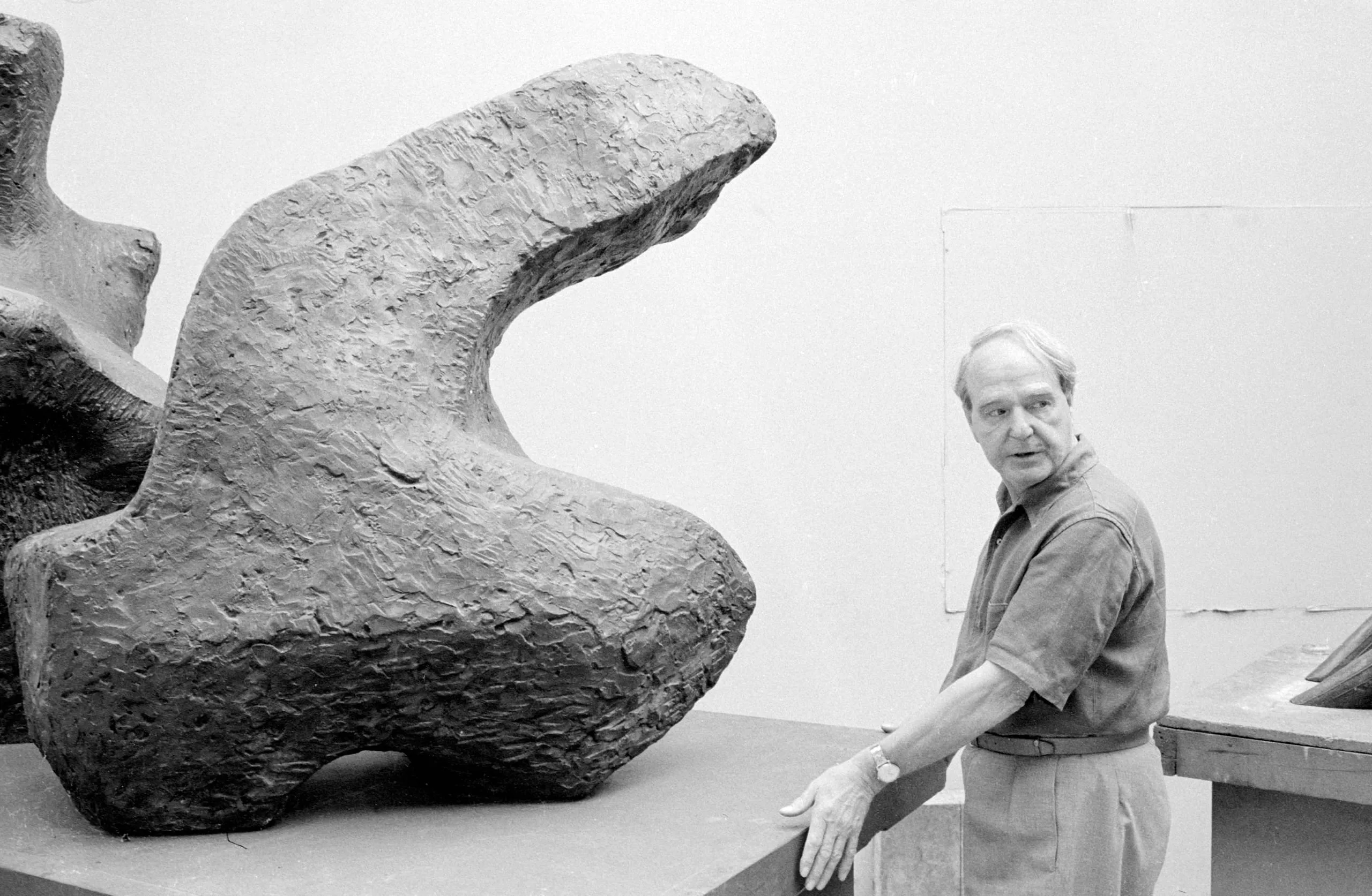 Black and white photograph of an older white man standing beside a large abstract sculpture with a rough, organic form in a studio setting