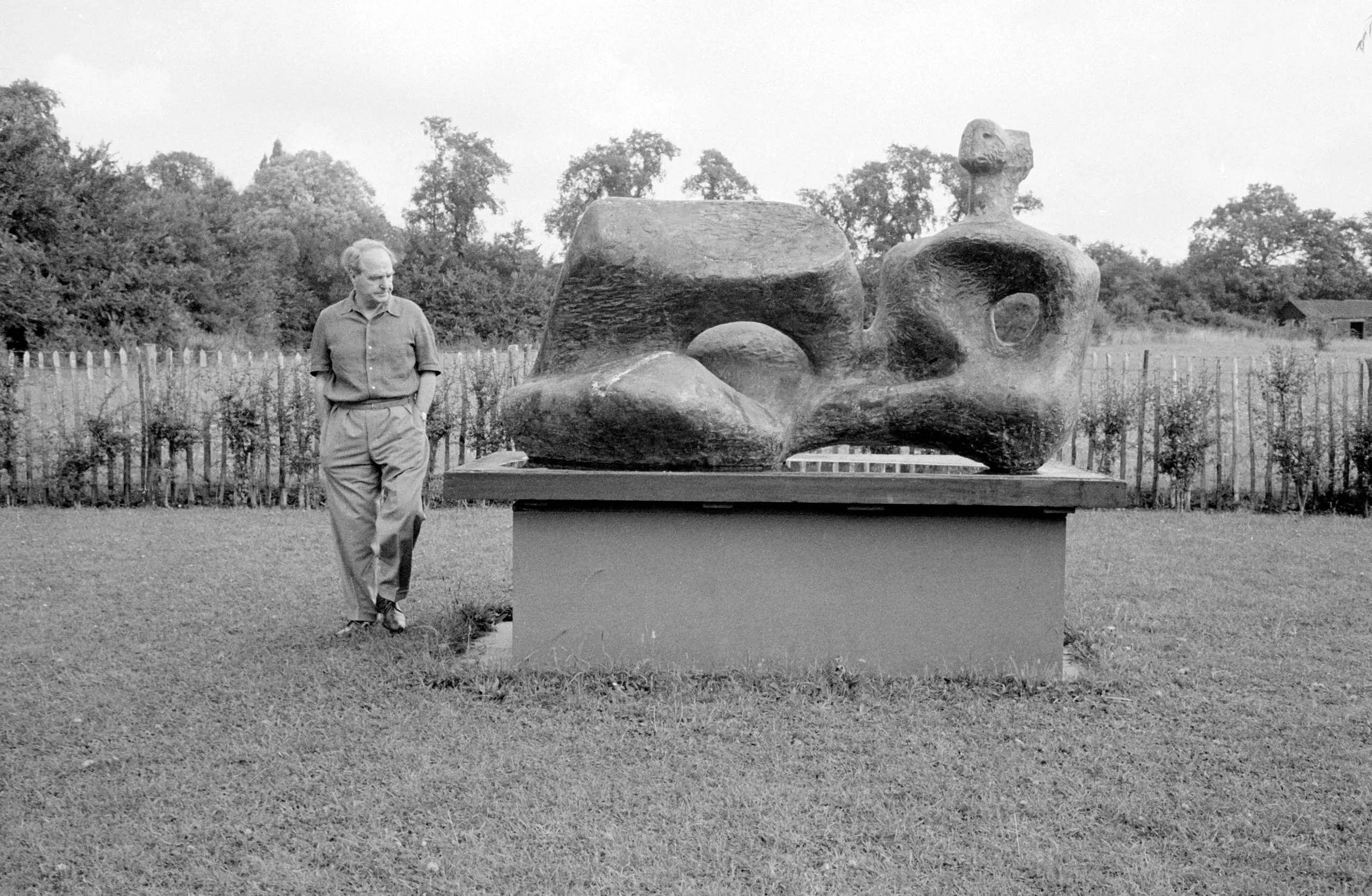 Black and white photograph of a man standing beside a large abstract sculpture of organic rounded forms with circular voids, mounted on a low pedestal outdoors on a grass lawn