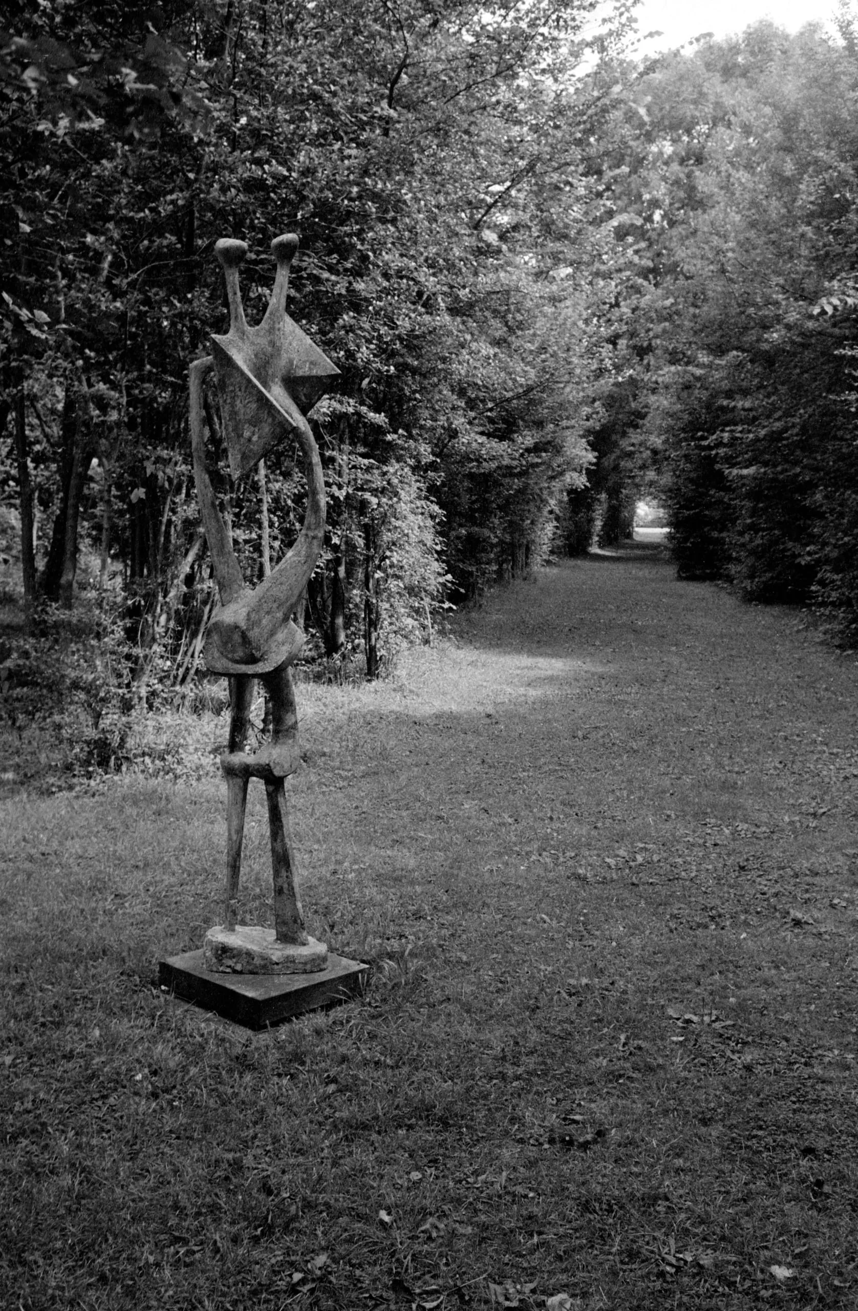 Black and white photograph of an abstract bronze sculpture on a flat base, installed on a grass lawn beside a tree-lined path