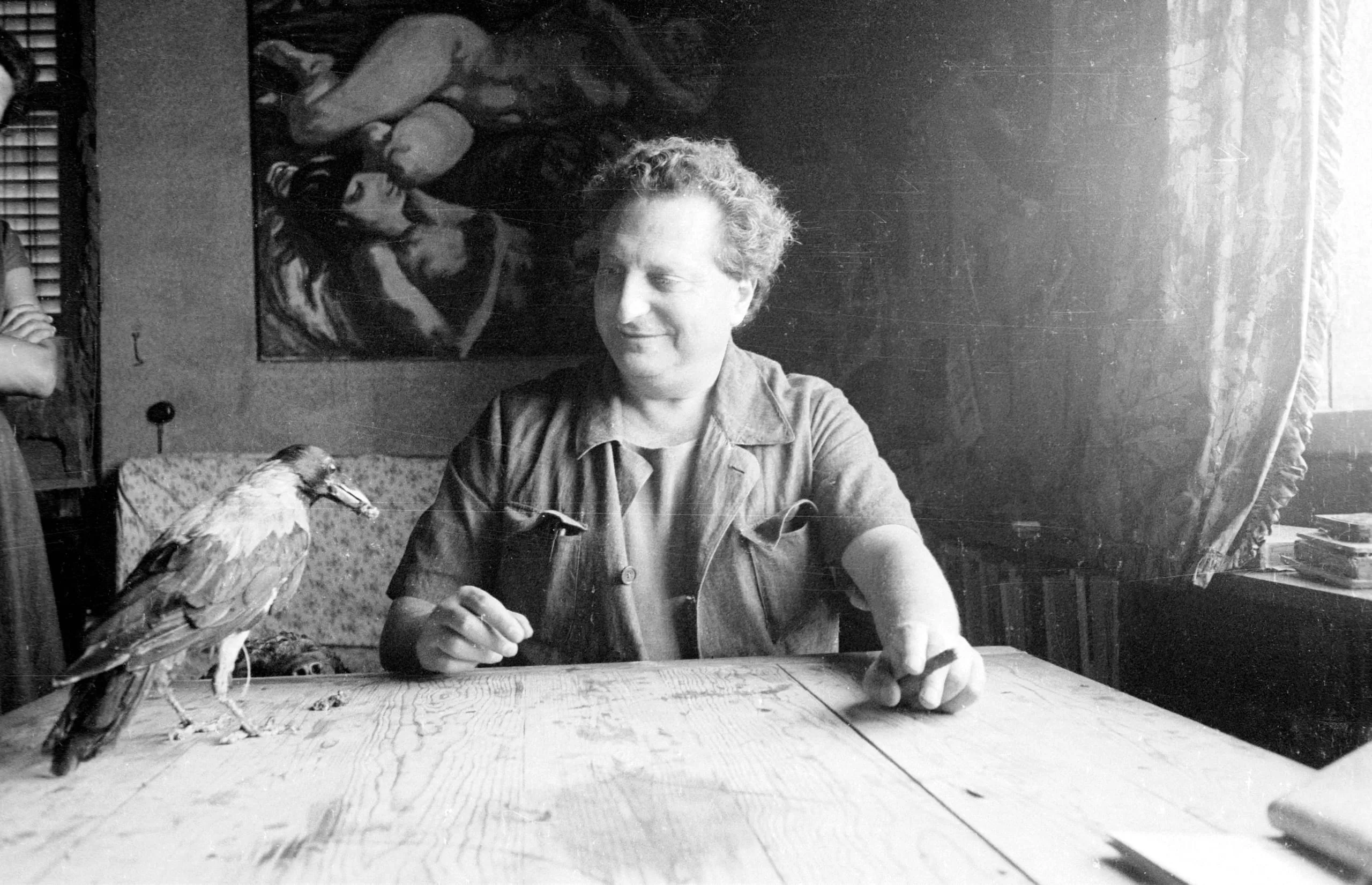 Black and white photograph of a curly-haired man at a wooden table extending his hand toward a large bird perched on the table's edge, indoors