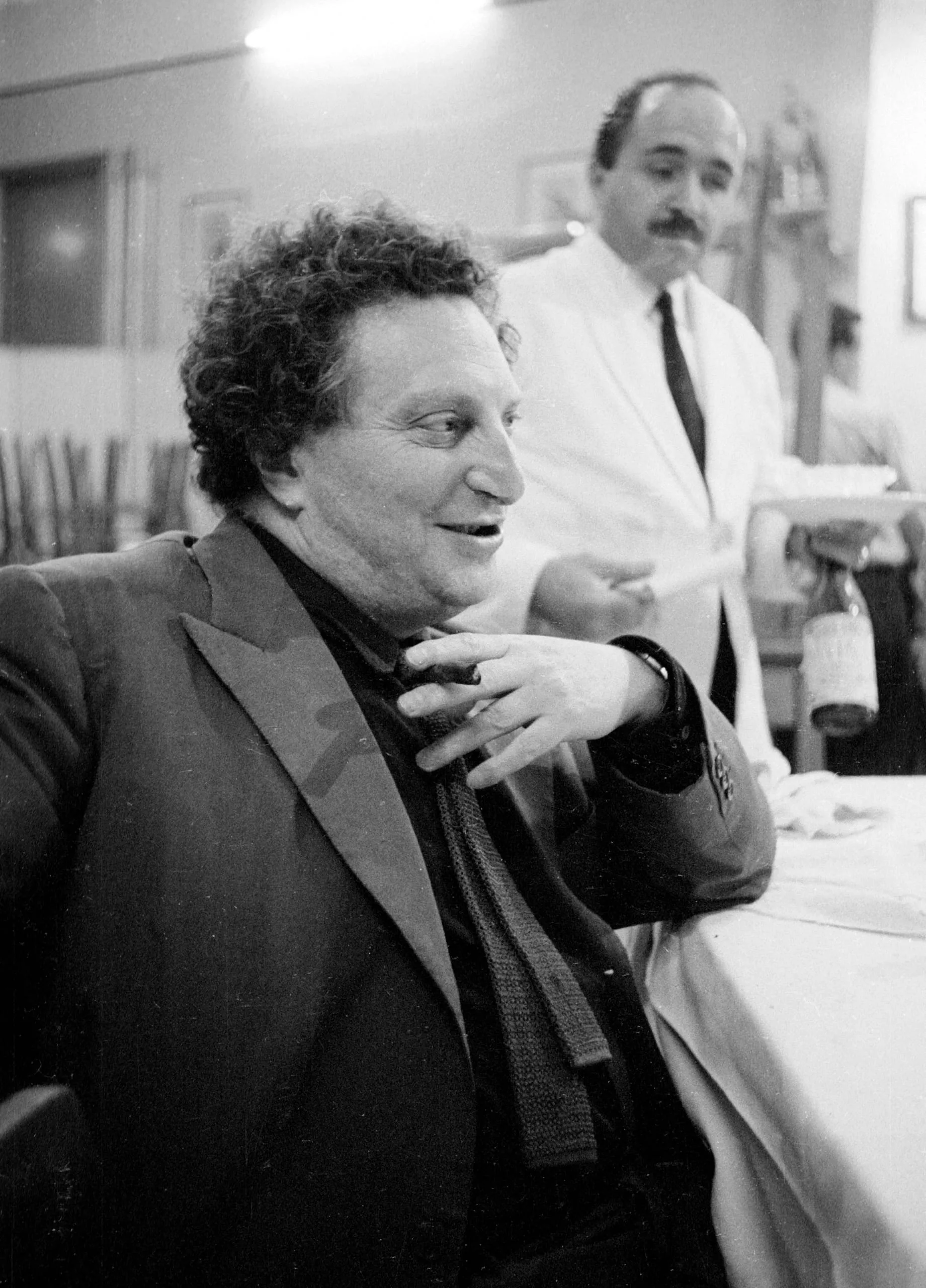 Black and white photograph of two men in a restaurant, one seated in the foreground holding a cigar, one standing behind holding a wine bottle