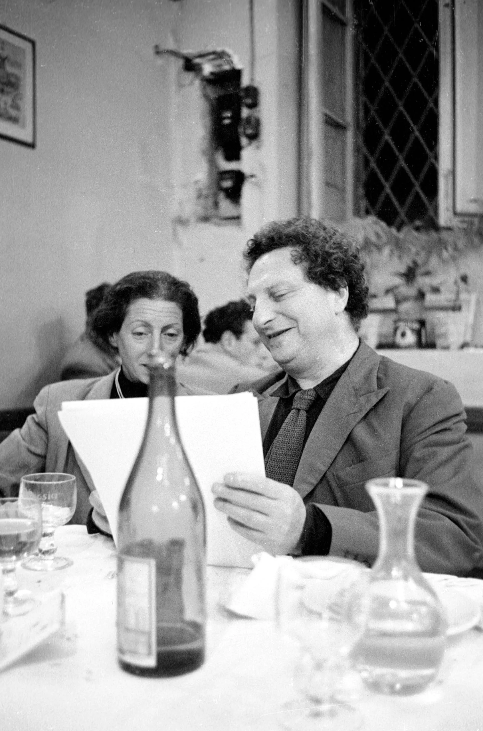 Black and white photograph of a curly-haired man reading papers at a restaurant table, with a woman seated behind him to the left