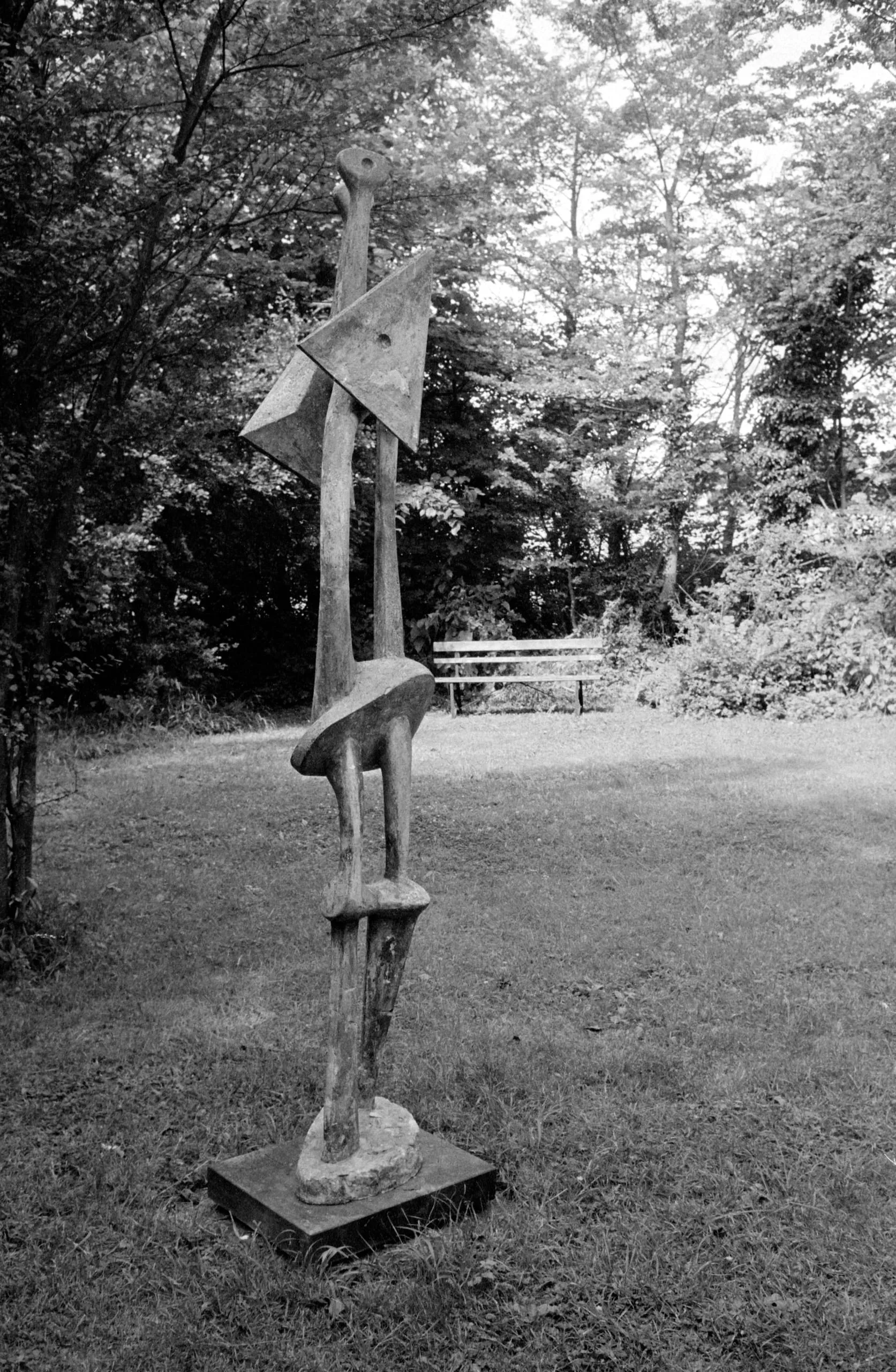 Tall abstract outdoor sculpture in cast metal with stacked organic forms — leg-like arches, a wide disc, angular blade shapes, and a small knob at top — mounted on a square base on a grass lawn