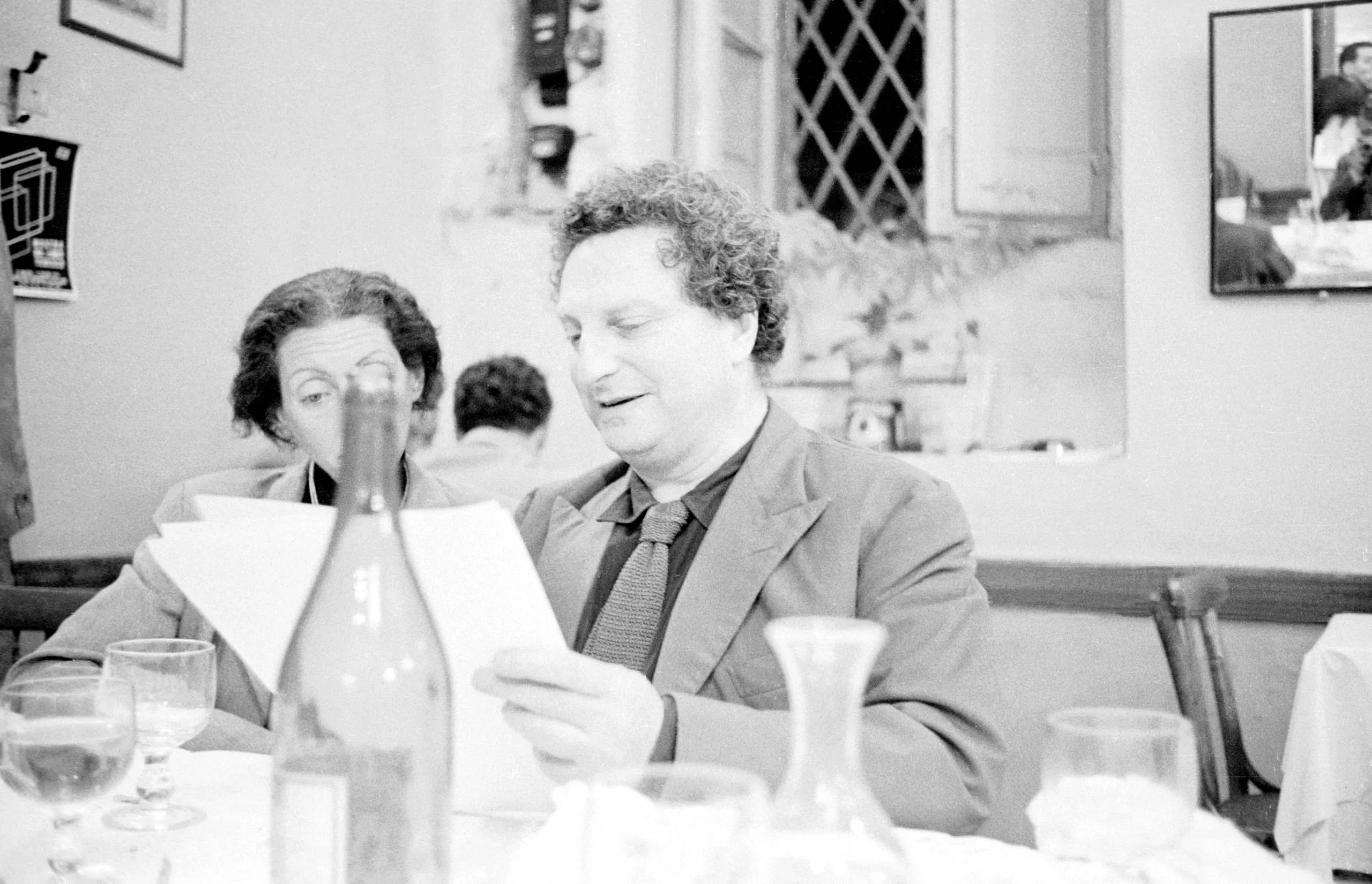 Black and white photograph of two people at a restaurant table, a curly-haired man reading a paper and a woman looking toward him, wine bottles and glasses in the foreground