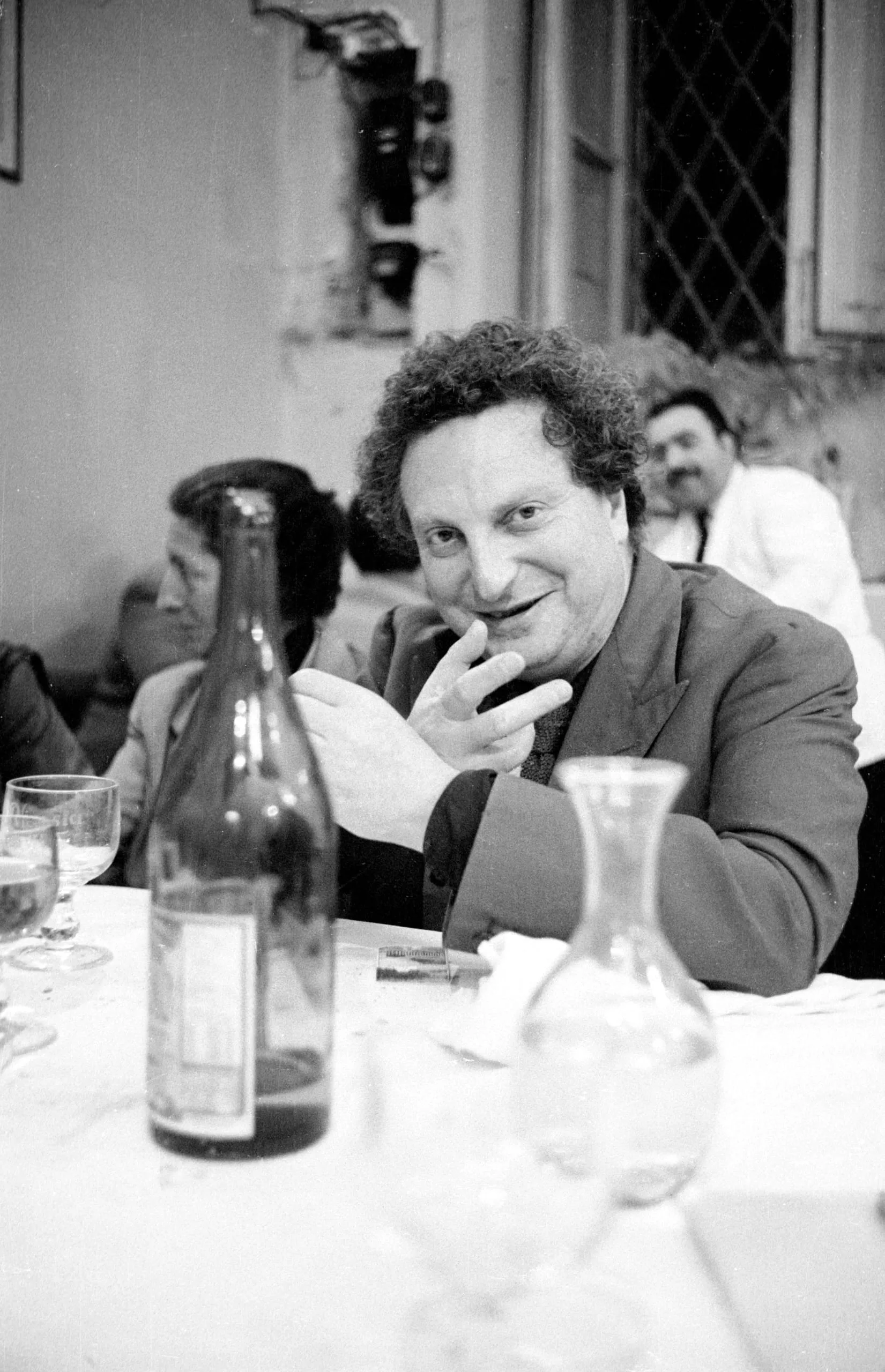 Black and white photograph of a curly-haired man in a dark blazer seated at a white-clothed table, smiling and gesturing, with a wine bottle and carafe in front