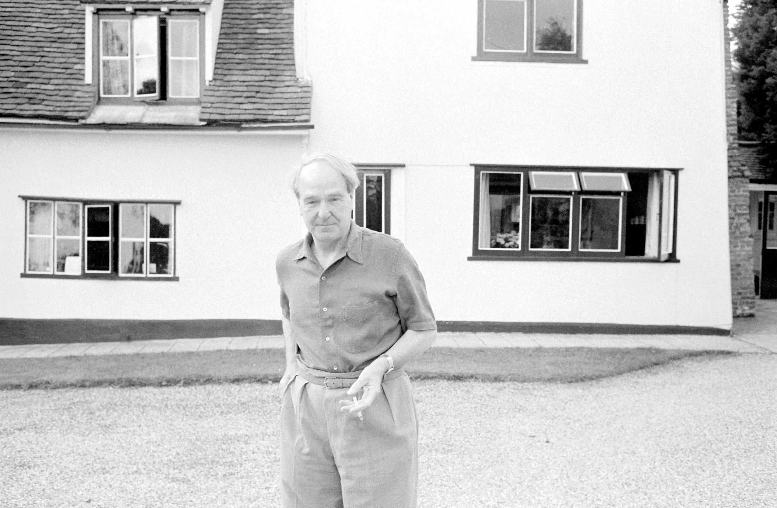 Black and white photograph of an older white man in a short-sleeved shirt and pleated trousers standing on gravel in front of a two-story white stucco house, holding a cigarette