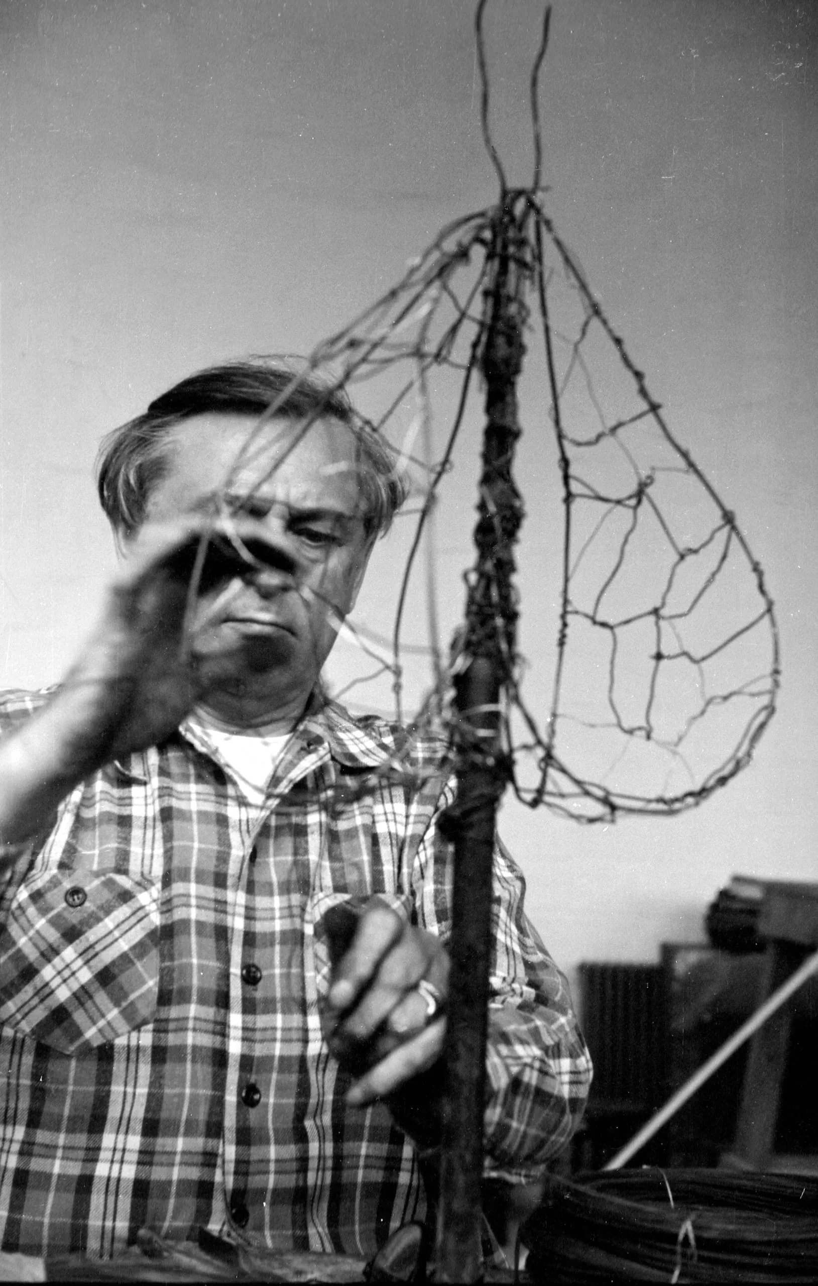 Black and white photograph of a man in a plaid shirt working on a wire sculpture wrapped around a wooden branch, viewed from the waist up