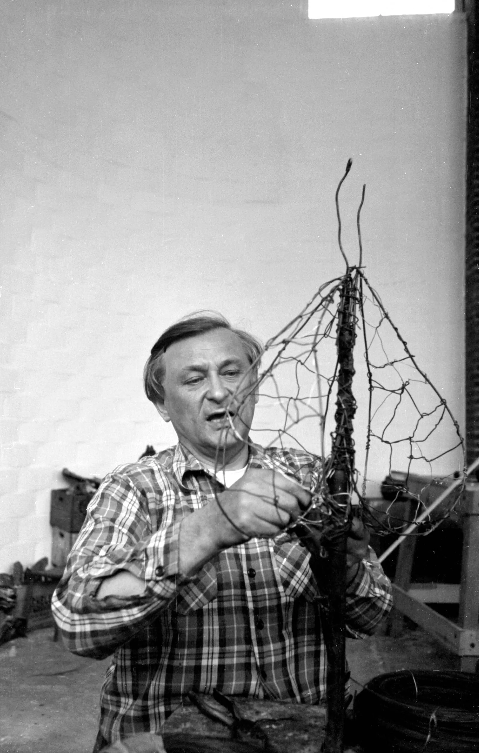 Black and white photograph of a man in a plaid shirt examining a small wire sculpture with a web-like conical form, in a studio or workshop setting