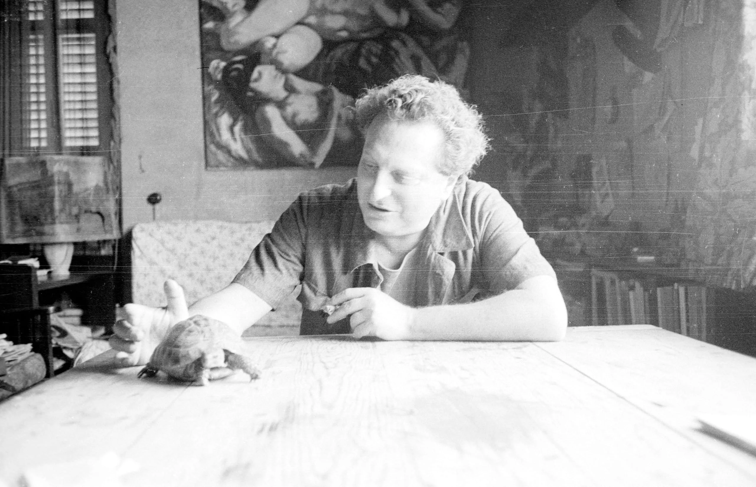 Black and white photograph of a curly-haired man leaning over a wooden table, pointing toward a small tortoise, with a large figurative painting visible on the wall behind him