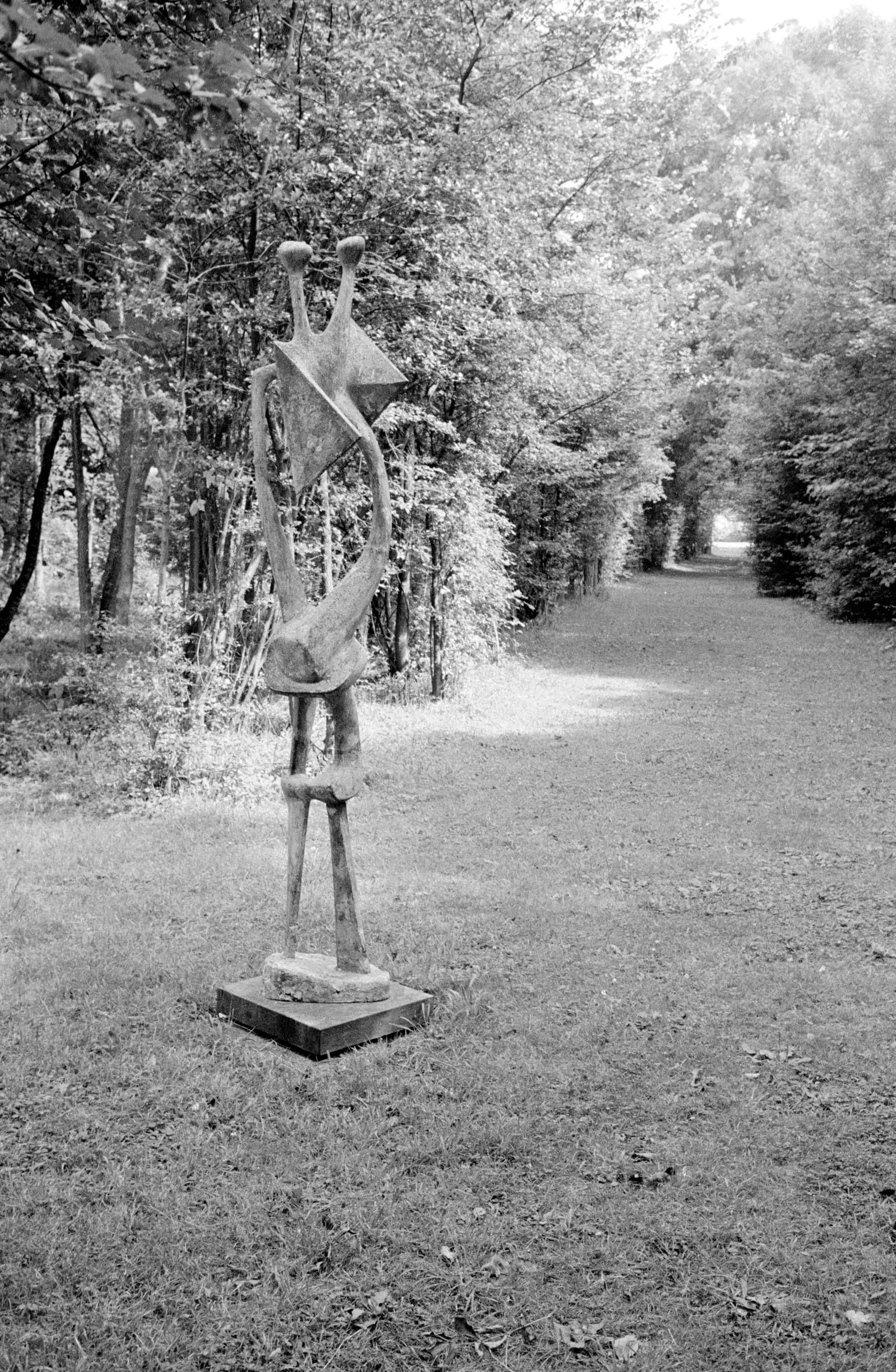 Black-and-white photograph of an abstract bronze sculpture with interlocking curved and linear forms on a flat plinth, set on a lawn beside a tree-lined path