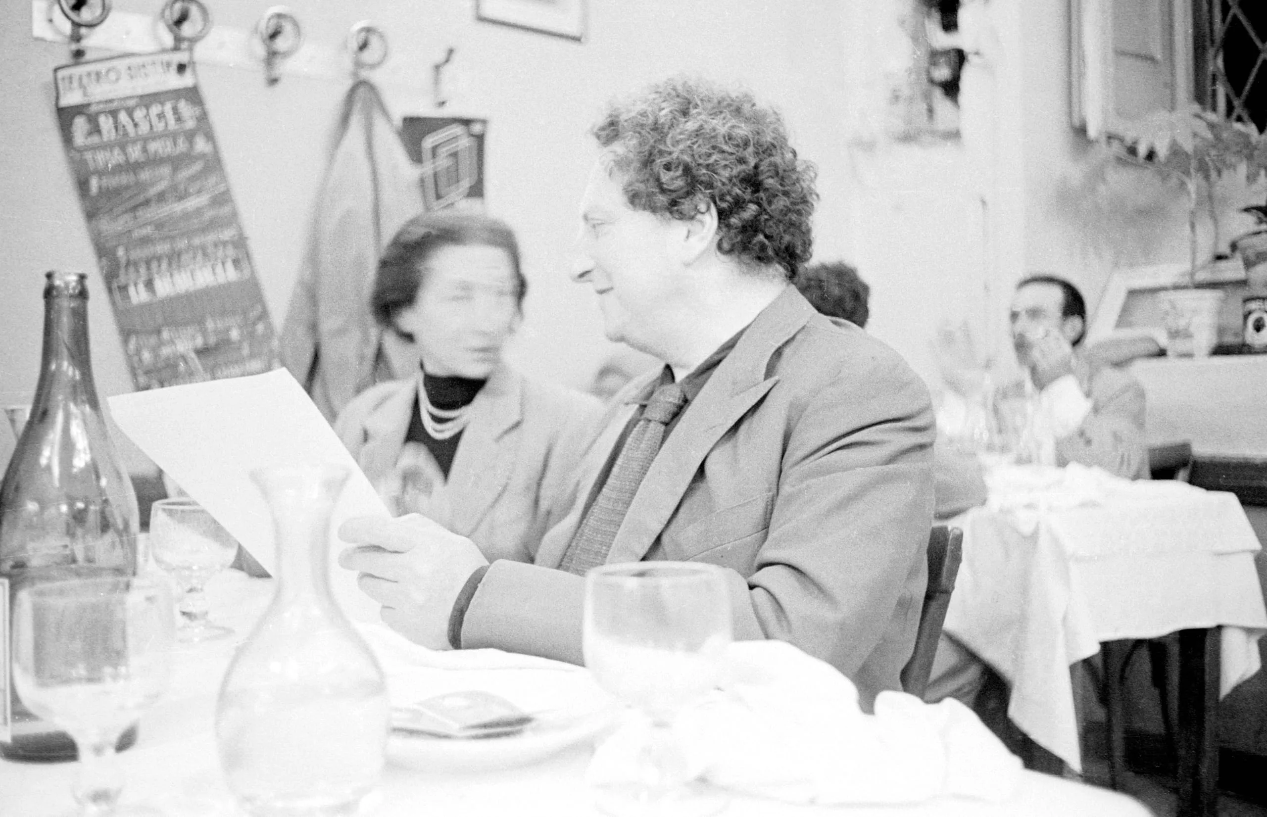 Black and white photograph of a curly-haired man reading a paper at a restaurant table with wine glasses and a carafe, other diners visible behind him
