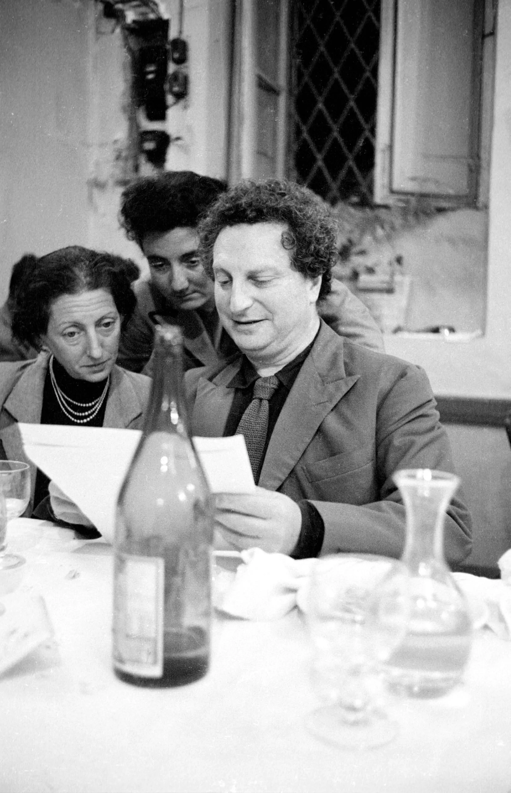 Black and white photograph of three people around a white-clothed dining table, a curly-haired man in a blazer reading from a sheet of paper