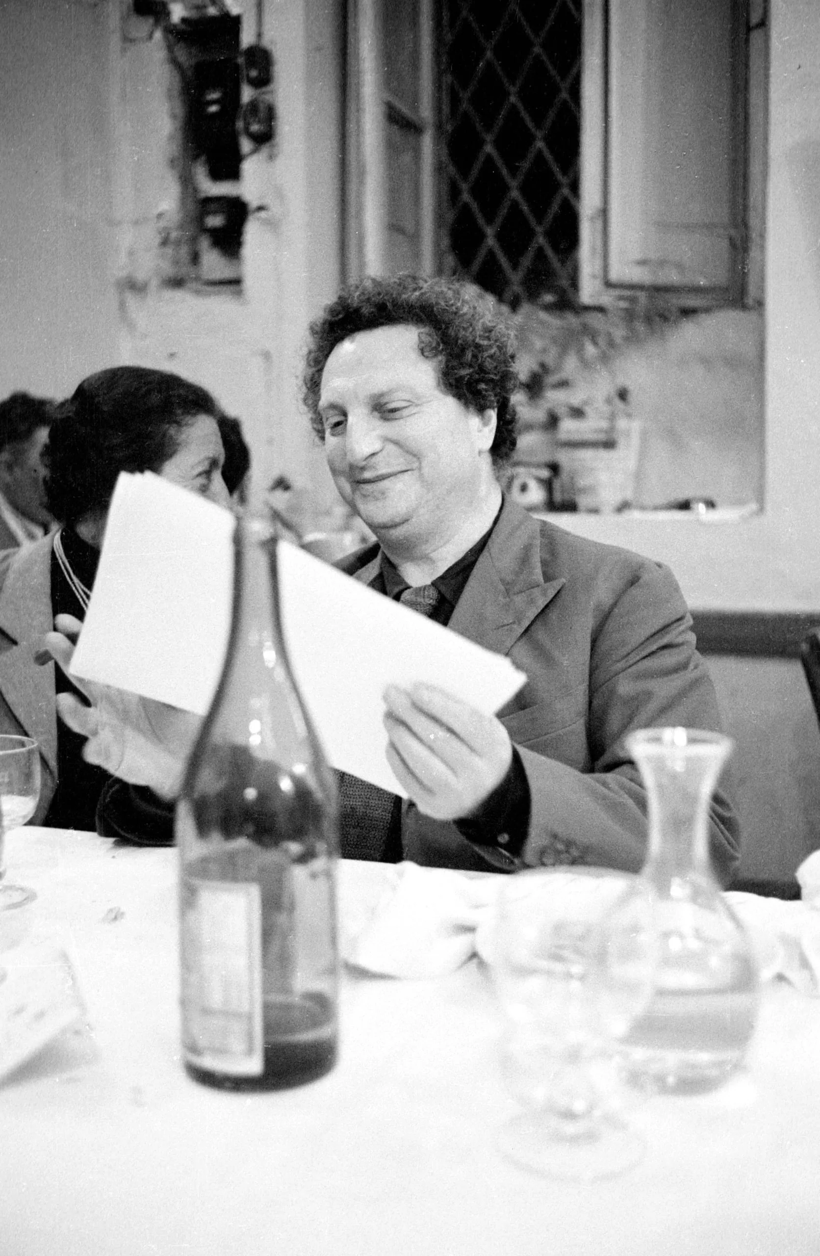 Black and white photograph of a man reading a folded paper at a dining table, wine bottle and decanter in the foreground, a woman beside him