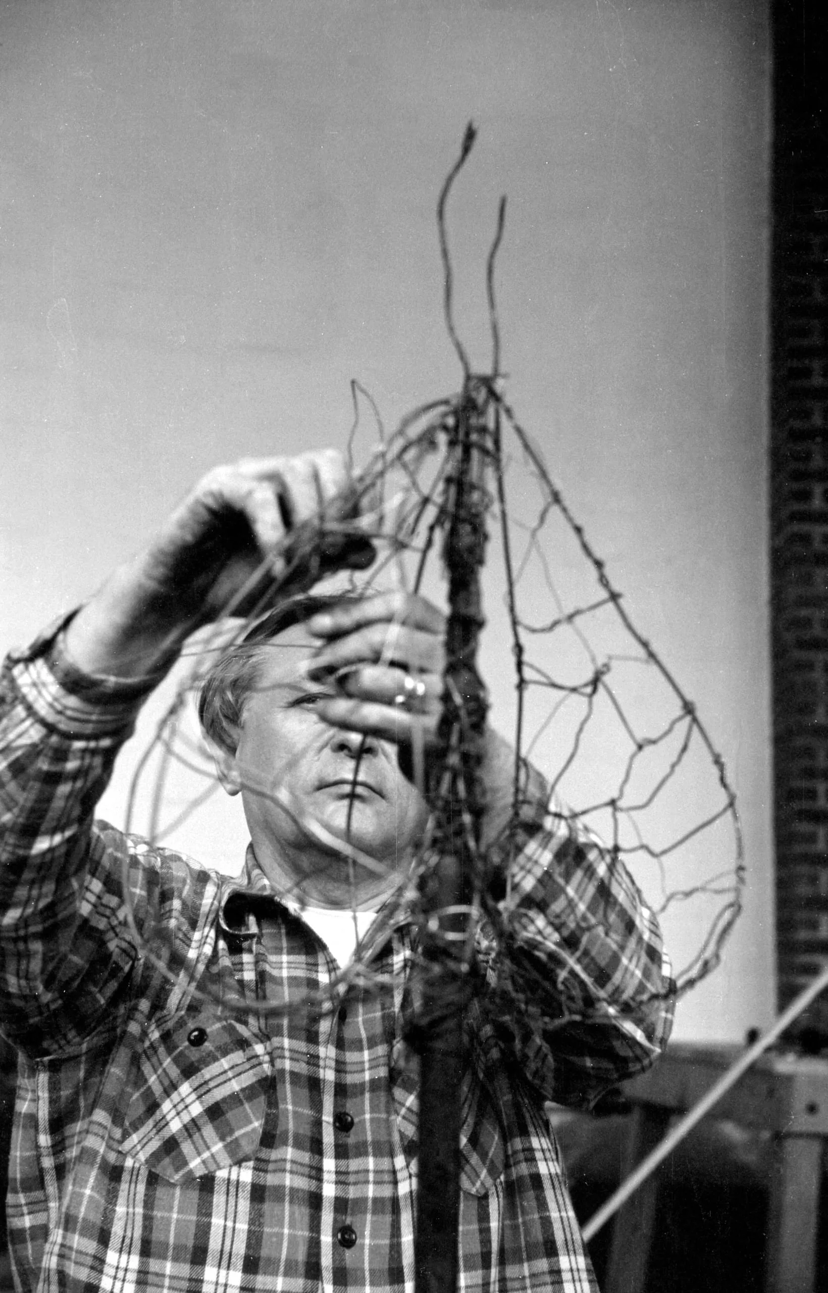 Black and white photograph of a man in a plaid shirt holding a wire-and-twig sculptural form above his face, indoors