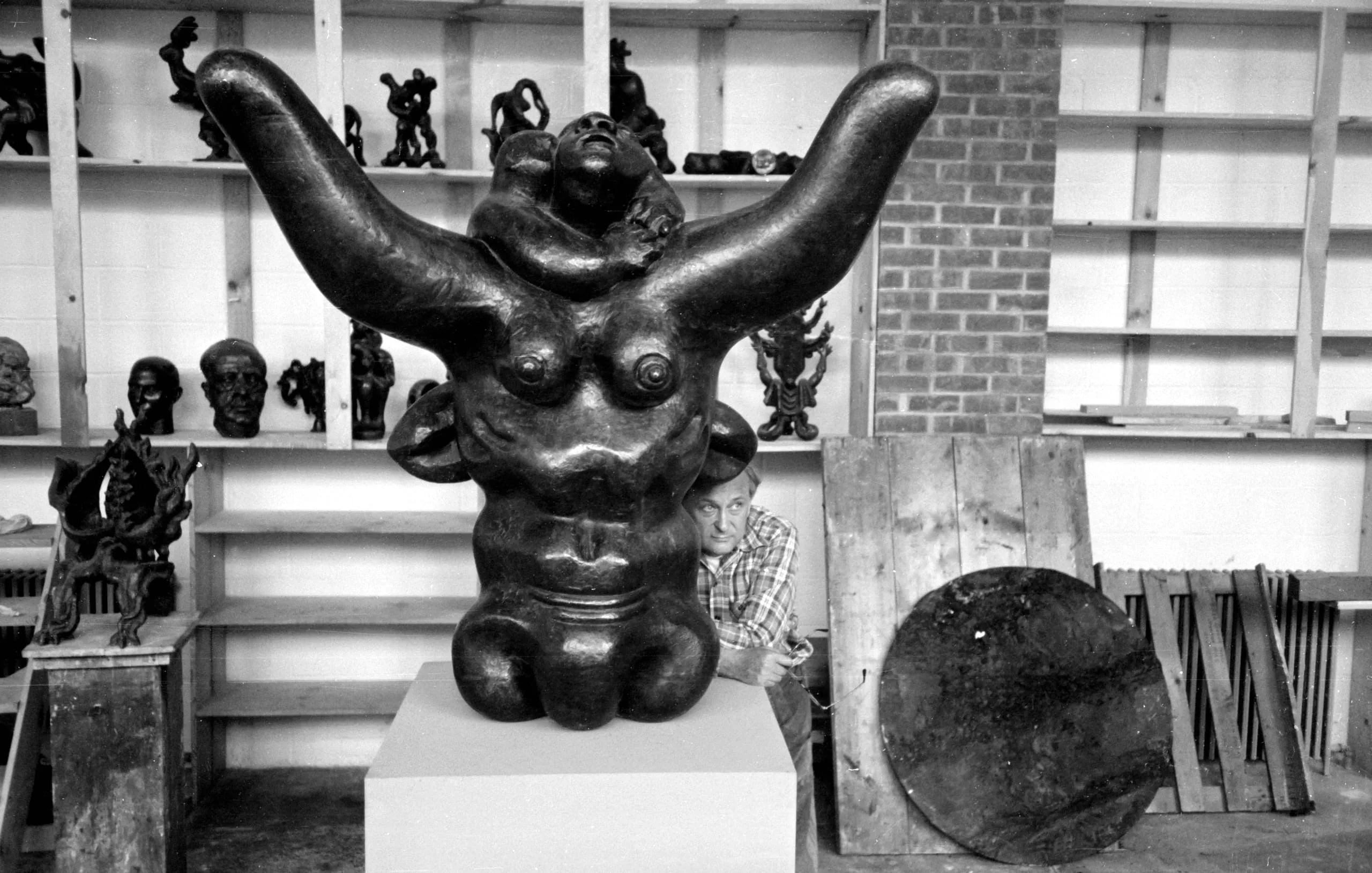 Black and white photograph of a large dark bronze female torso sculpture with wide horn-like raised arms on a white pedestal in a sculptor's studio, smaller figures visible on shelves behind