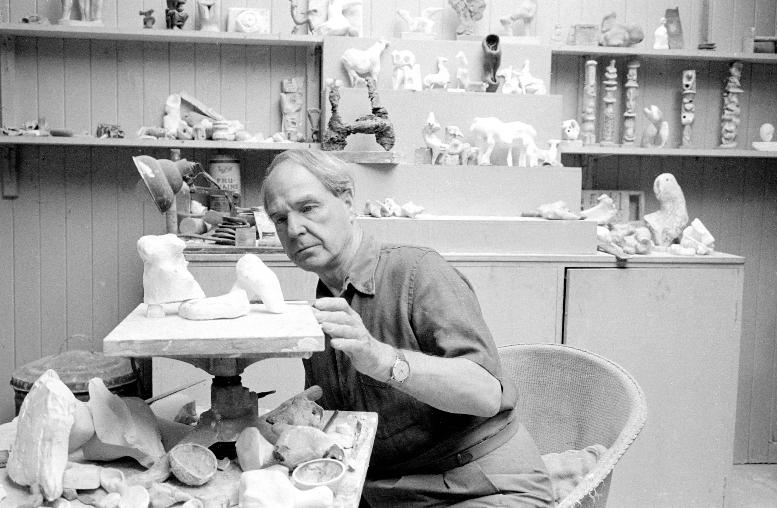 Black and white photograph of a man in a studio reaching toward a small plaster figurative sculpture, surrounded by dozens of small sculptures on shelves