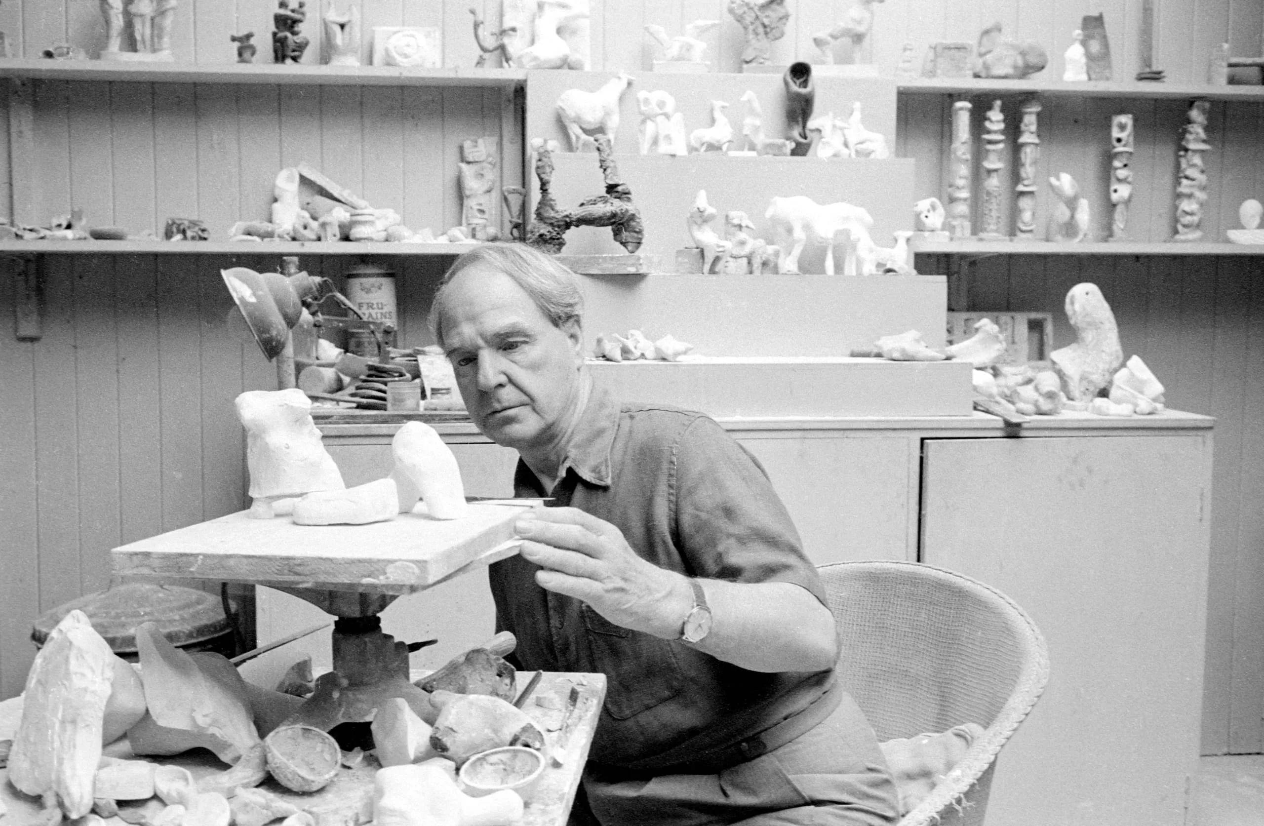 Black and white photograph of a man seated at a cluttered work table, reaching toward a small pale sculptural figure, with shelves of small sculptures filling the background