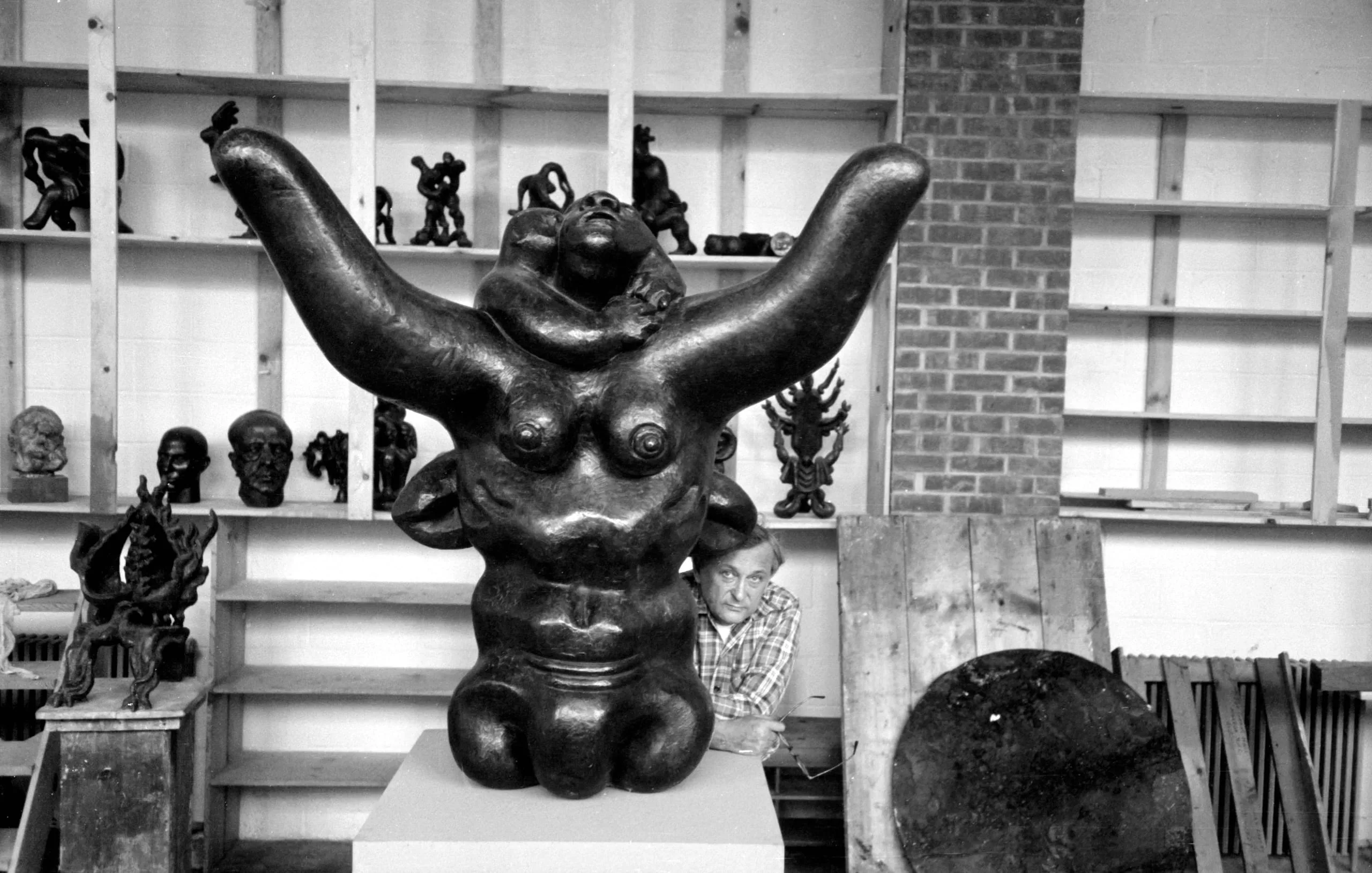 Black and white photograph of a large, dark-patinated bronze sculpture of a fantastical horned figure with raised arms, displayed on a pedestal in an artist's studio
