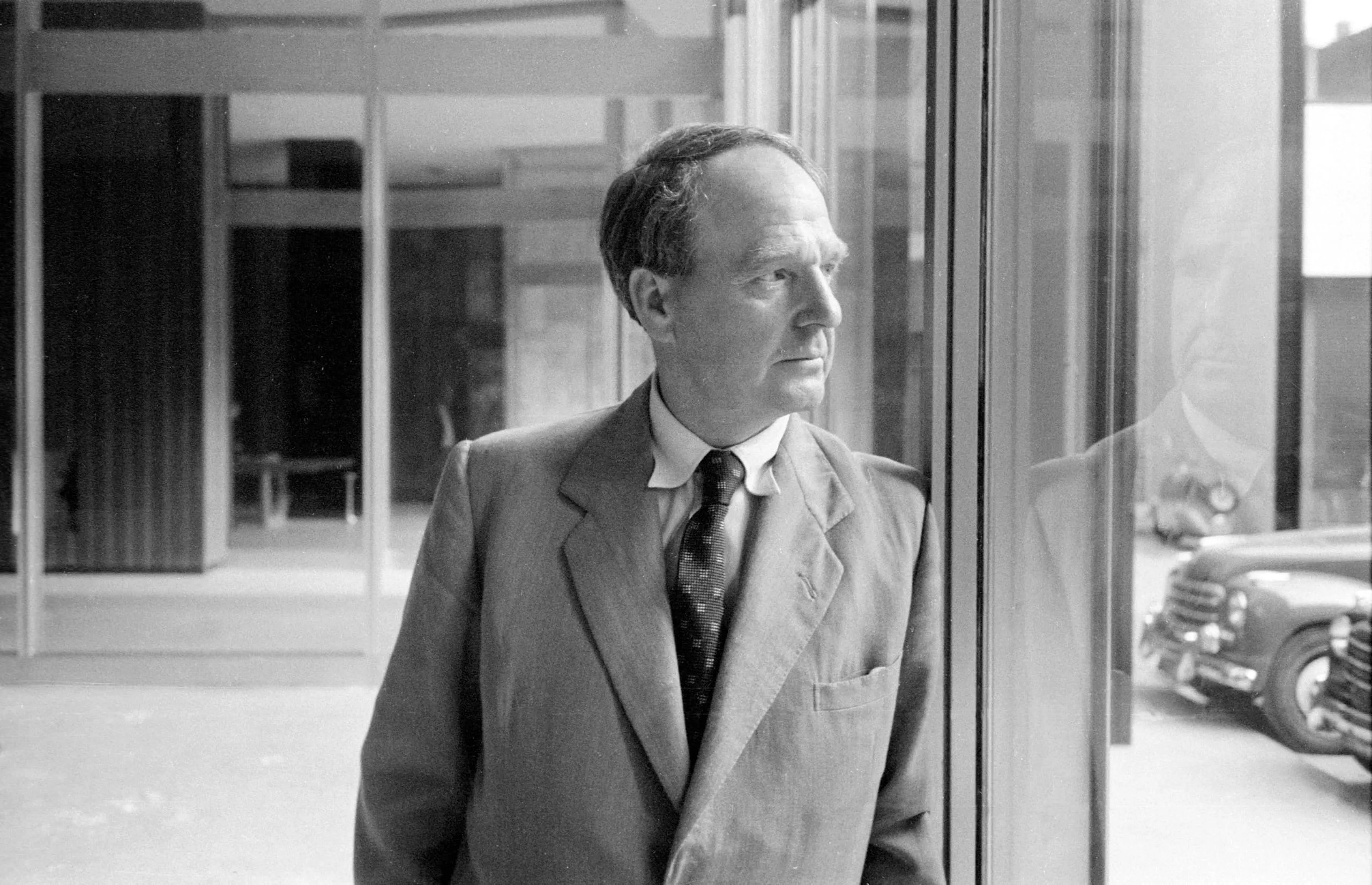 Black and white photograph of a white man in a suit and patterned tie, shown from the waist up, standing beside a glass facade and looking to his left