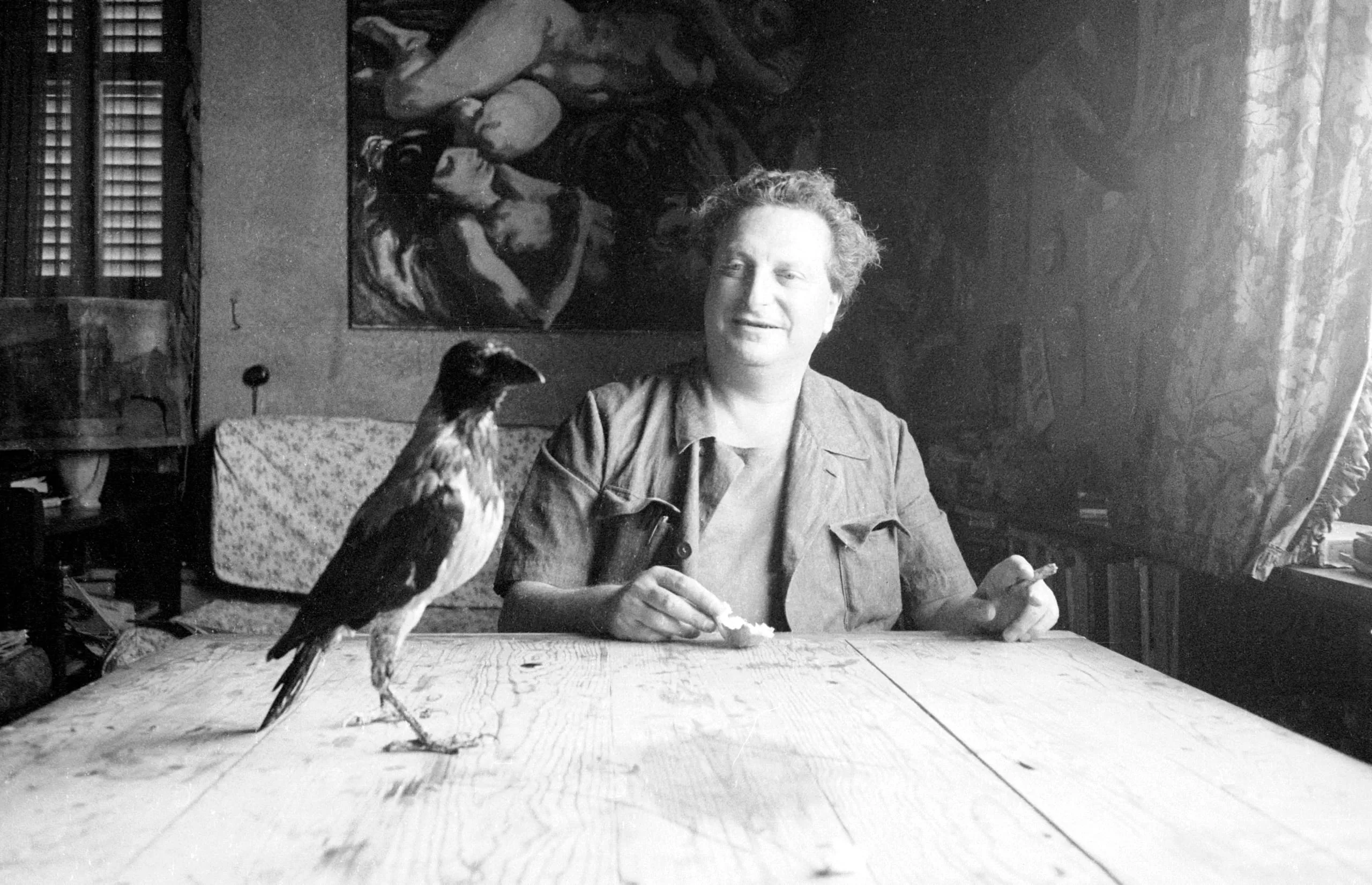Black and white photograph of a curly-haired man sitting at a worn wooden table, holding food toward a large crow or magpie perched on the tabletop, with a large painting visible on the wall behind him