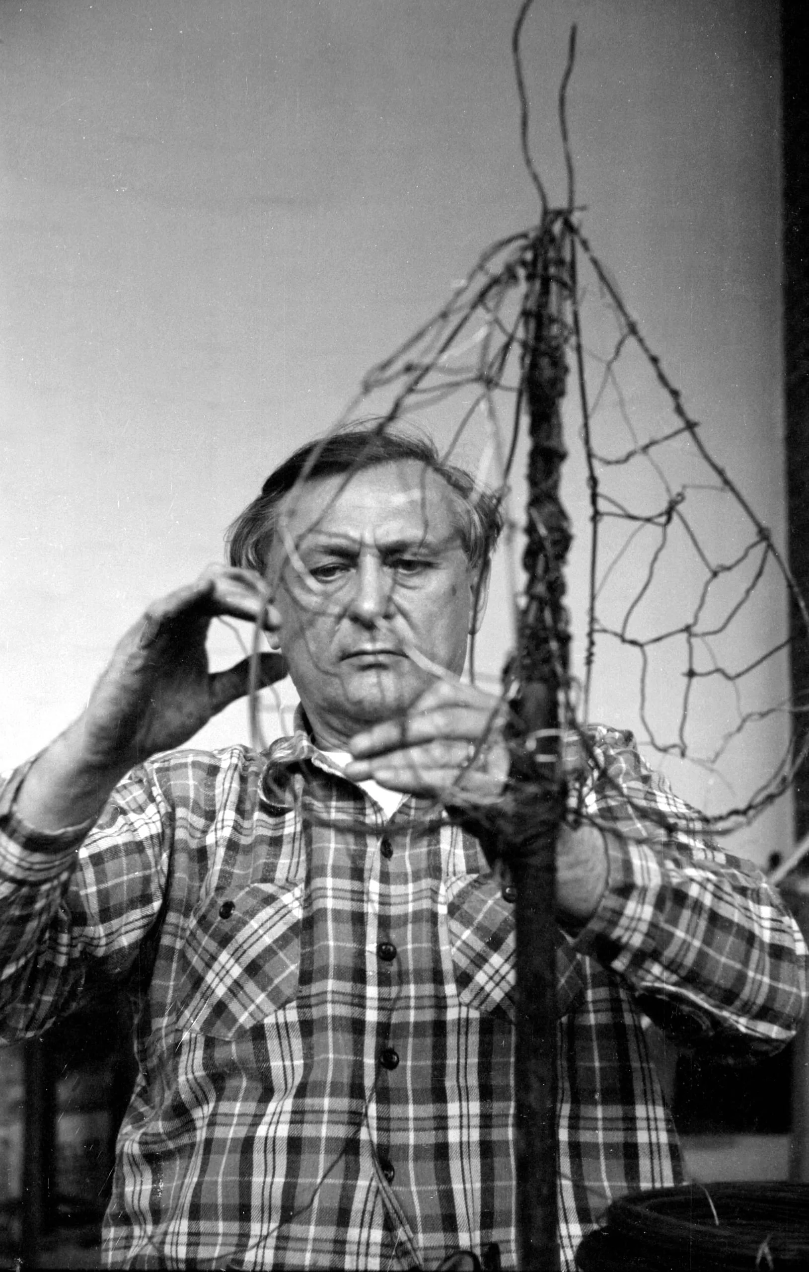 Black and white photograph of a white man from the chest up, examining a wire and twig sculpture in what appears to a studio setting