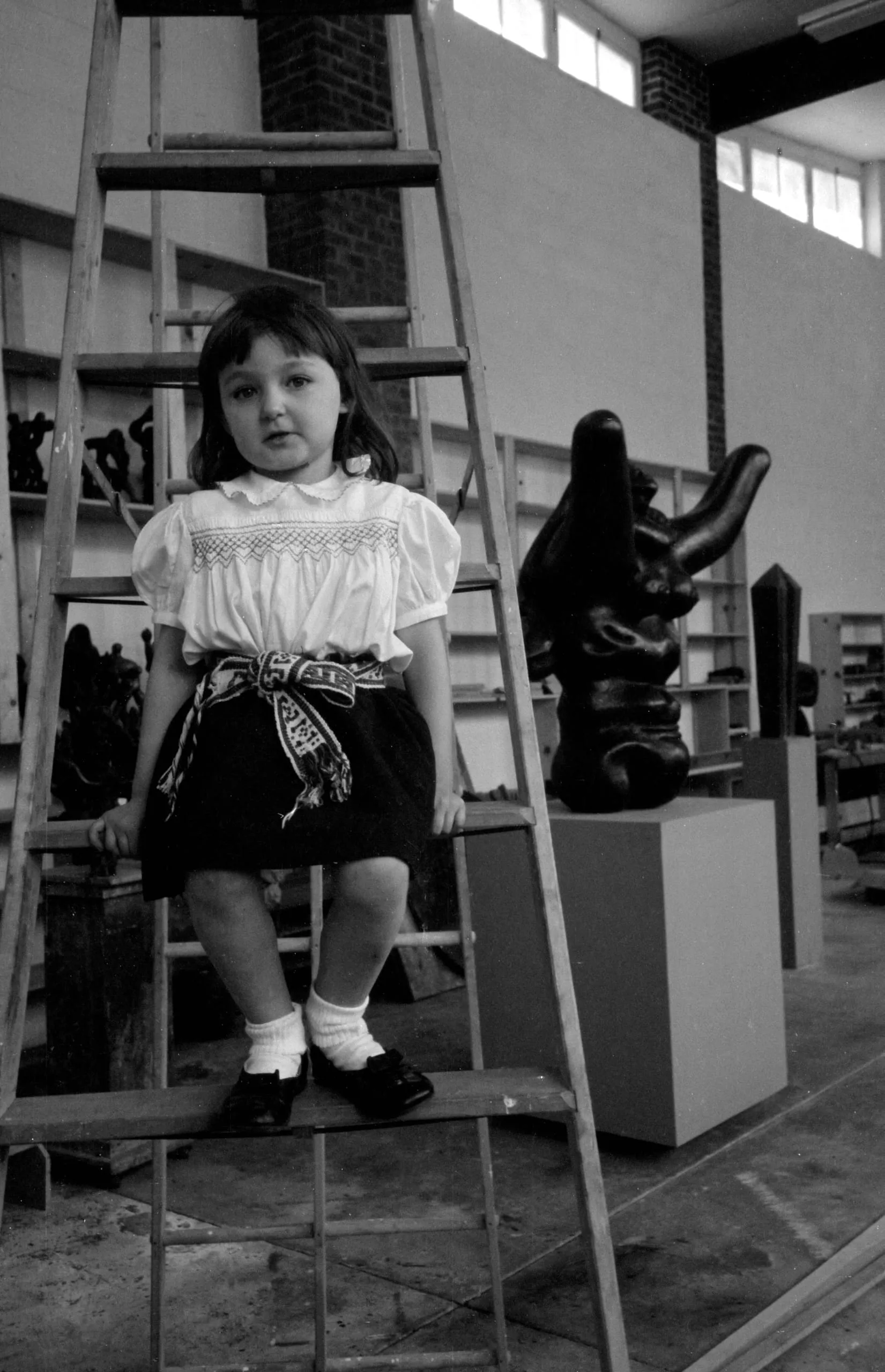 Black and white photograph of a young girl in a smocked blouse and dark skirt standing on a ladder rung in a sculptor's studio, with a dark abstract sculpture on a pedestal to the right