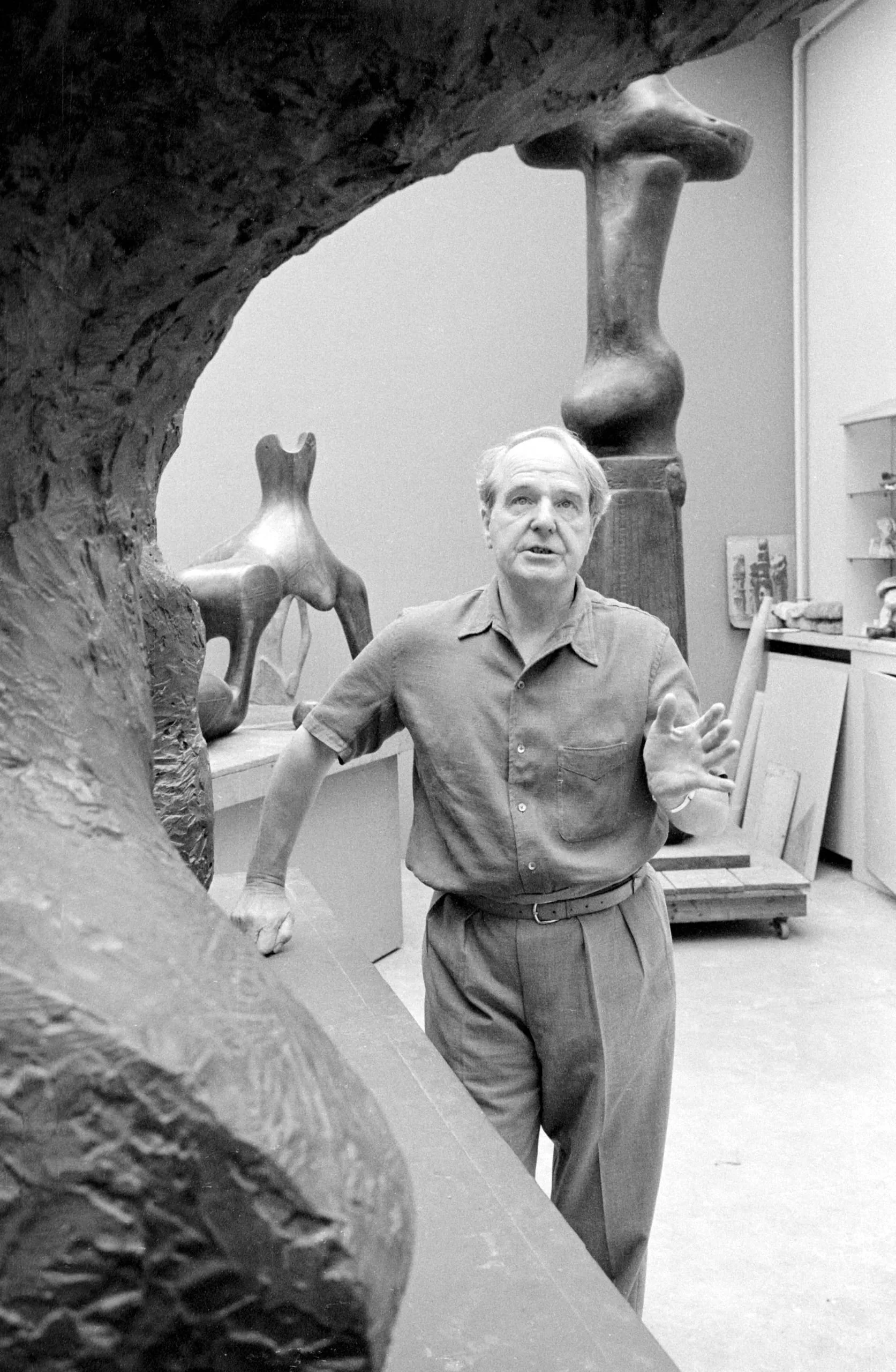 Black and white photograph of a man in a studio, framed by a large arched sculpture, with abstract bronze figures visible behind him