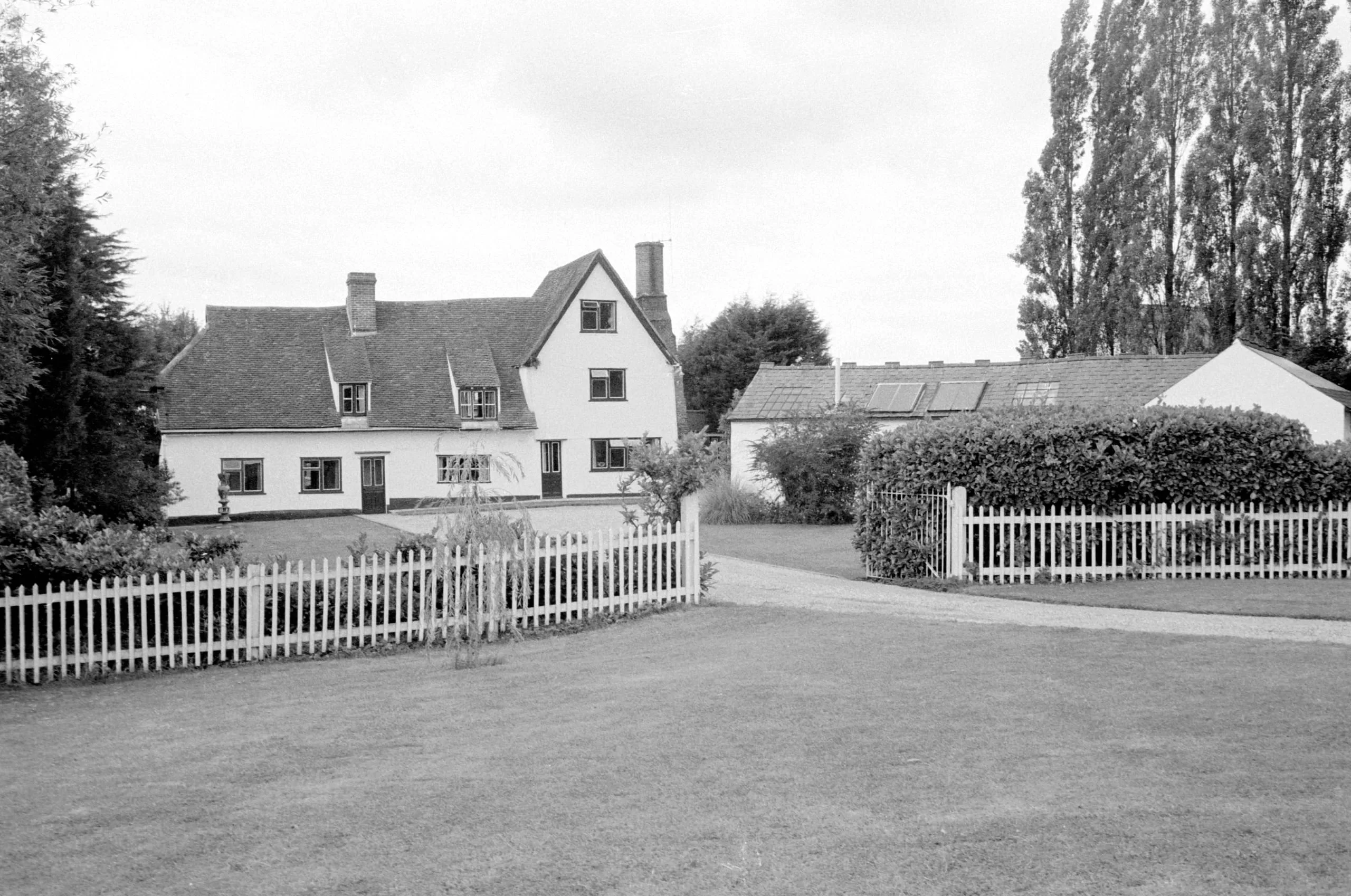 Black and white photograph of a white-rendered English country house with steeply pitched roof, viewed across a lawn behind a white picket fence