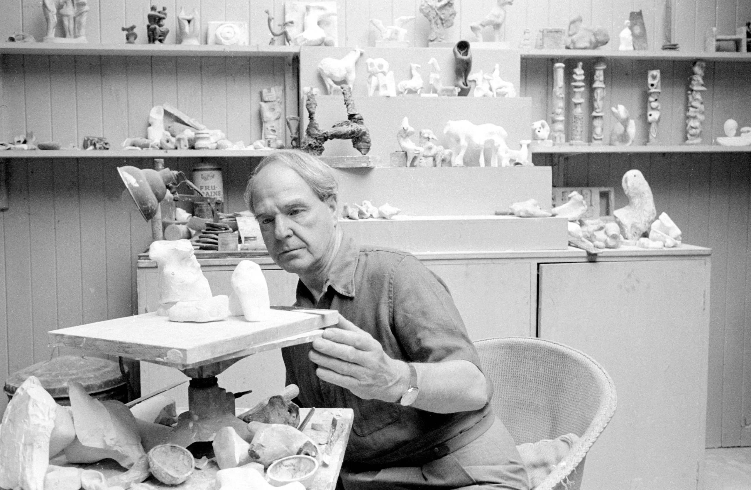 Black and white photograph of a man seated at a studio worktable, handling a small plaster sculpture, with shelves of white sculptural figures filling the background