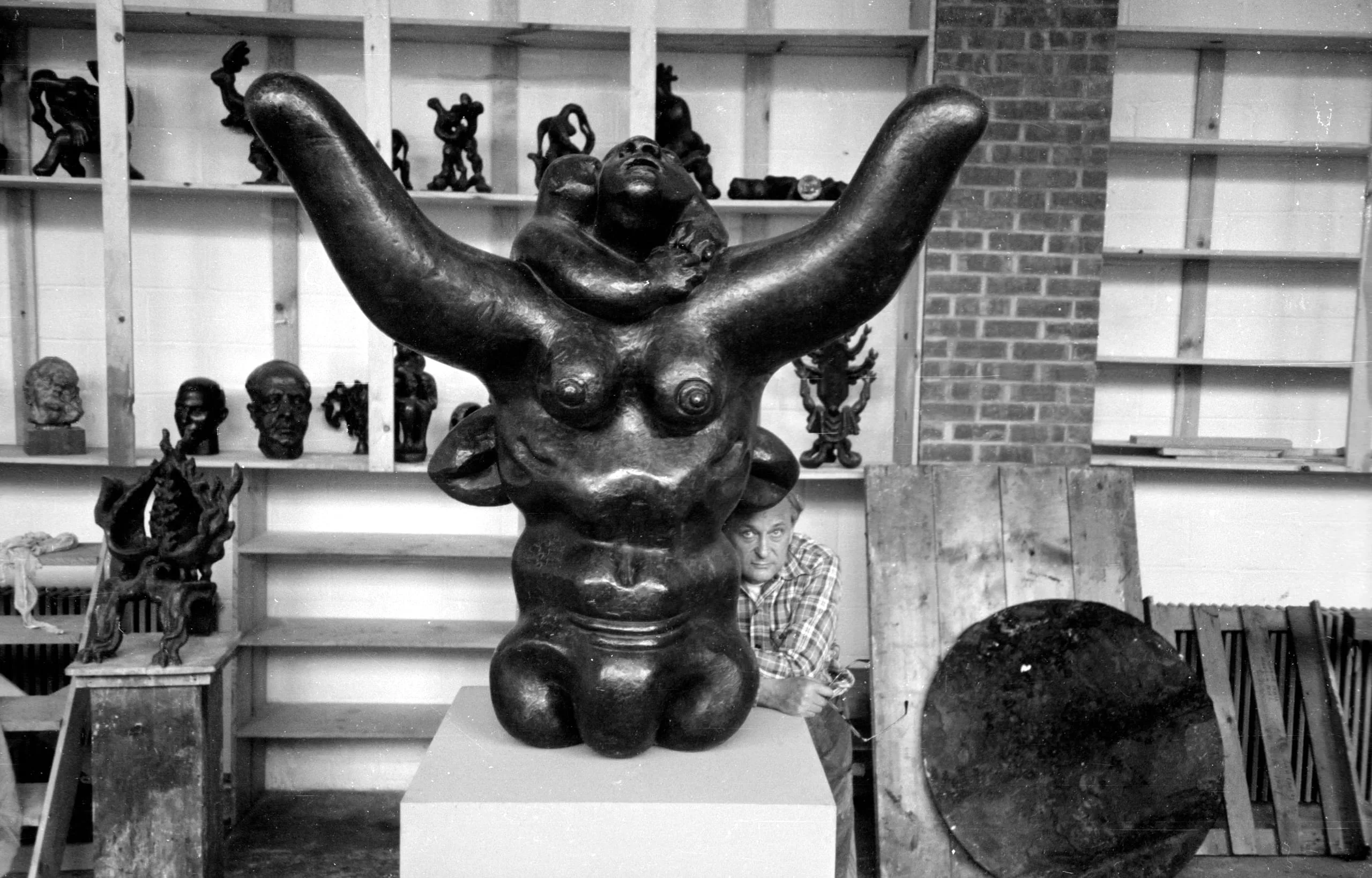 Large dark bronze sculpture of a fantastical, horned female torso on a white pedestal, photographed in a sculptor's studio lined with smaller works