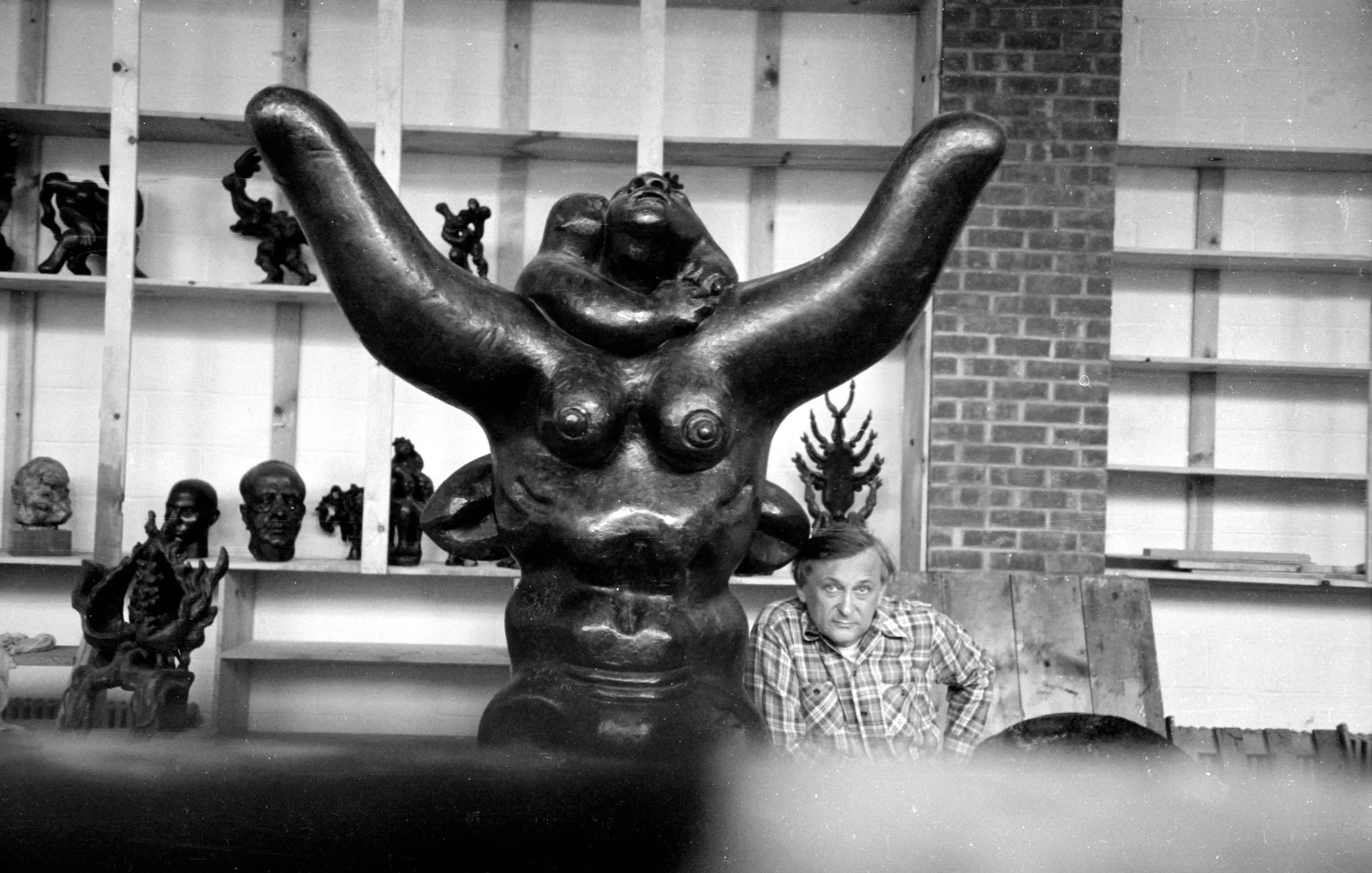 Black and white photograph of a large dark sculptural female torso with upraised horn-like arms in an artist's studio, a man in a plaid shirt standing behind it