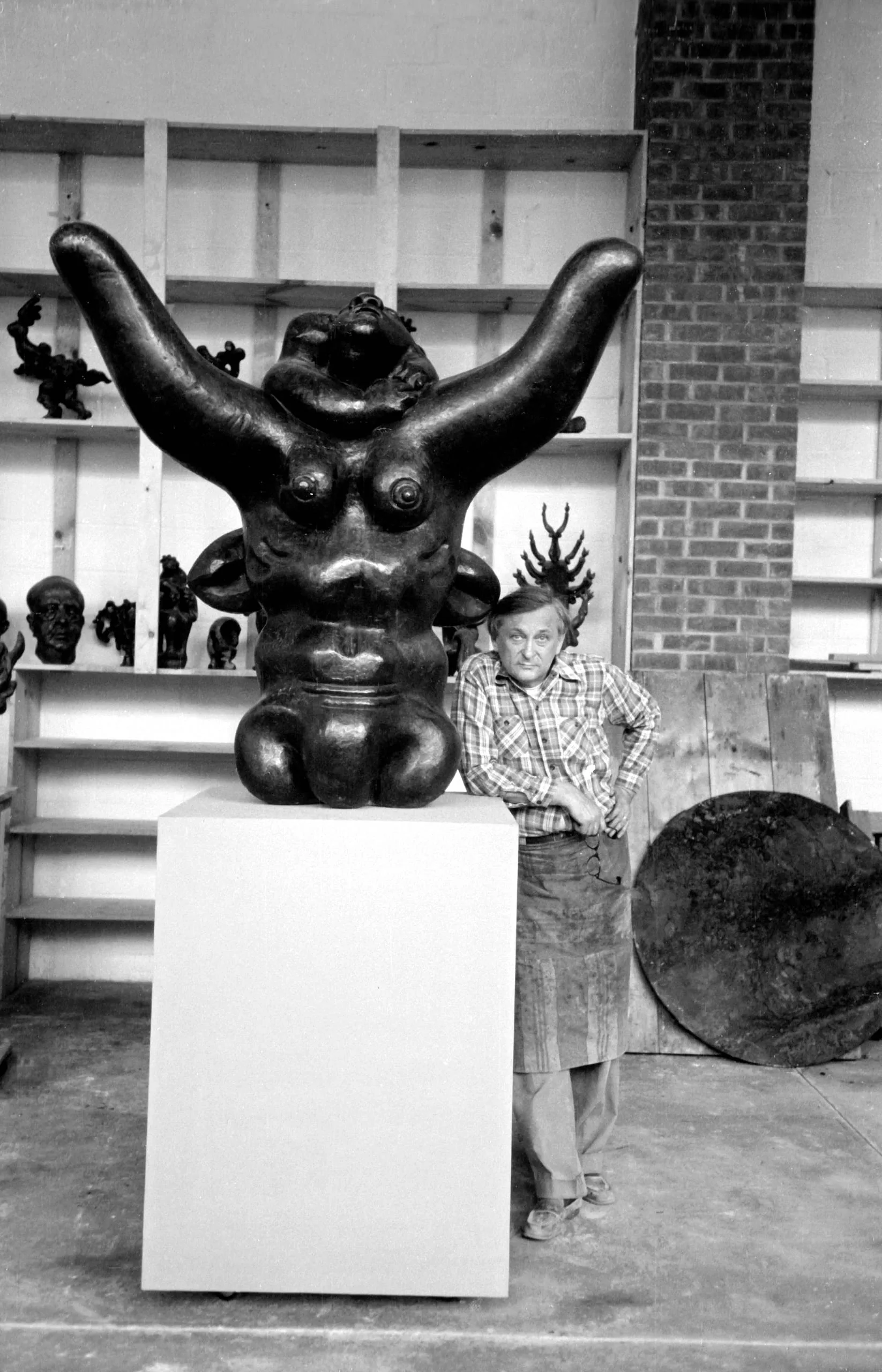 Black and white photograph of an older white man in a plaid shirt standing beside a large dark bronze figurative sculpture in an artist's studio