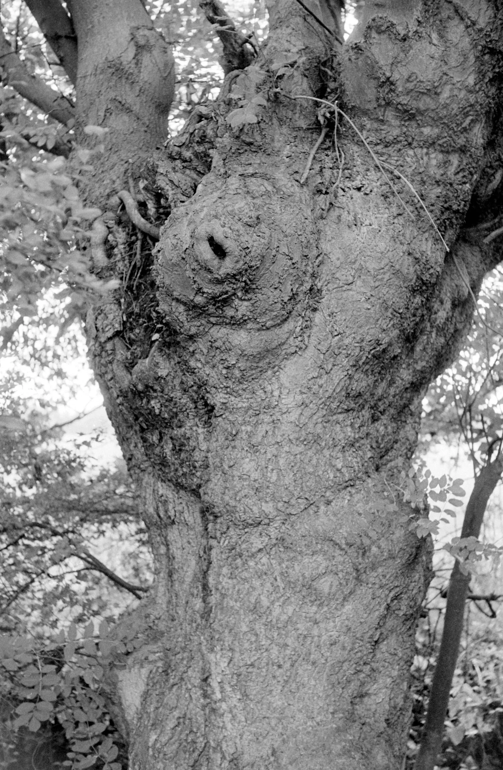 Black and white photograph of a massive, gnarled tree trunk filling the frame, with a large burl and small hollow at center