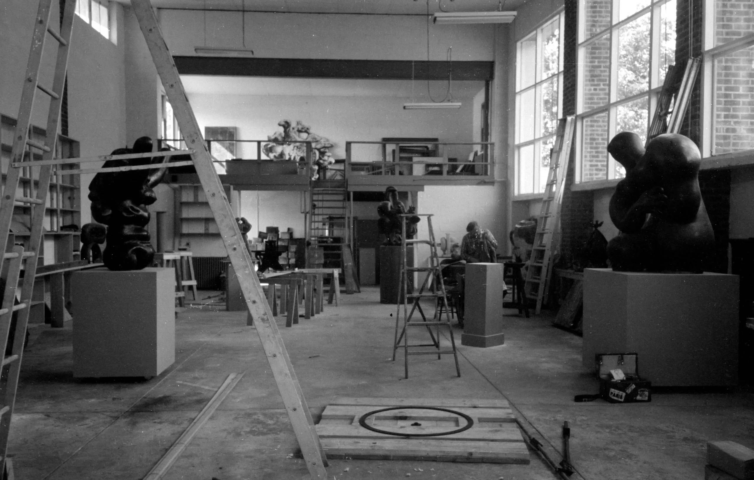 Black and white photograph of a sculptor's studio interior with dark abstract sculptures on pedestals, ladders, work tables, and a mezzanine level with large industrial windows along the right wall