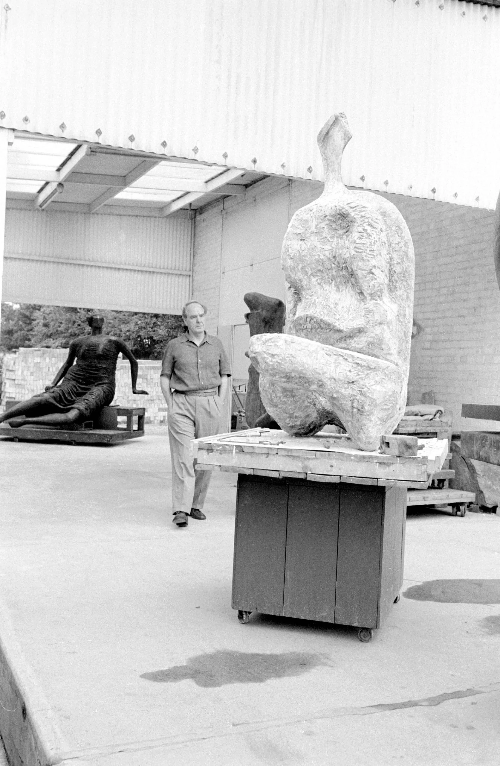 Black and white photograph of a man standing beside a large abstract plaster sculpture in an open-sided studio, with a dark reclining bronze figure visible in the background