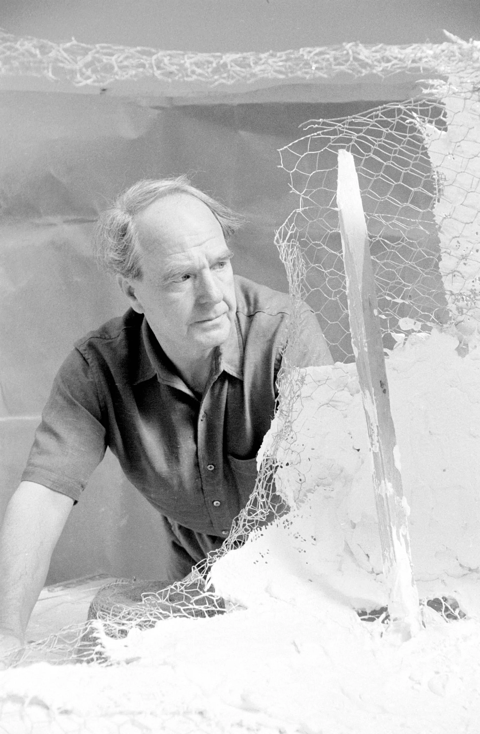 Black and white photograph, white man in dark polo shirt leaning over a sculptural assemblage of chicken wire and plaster, looking left