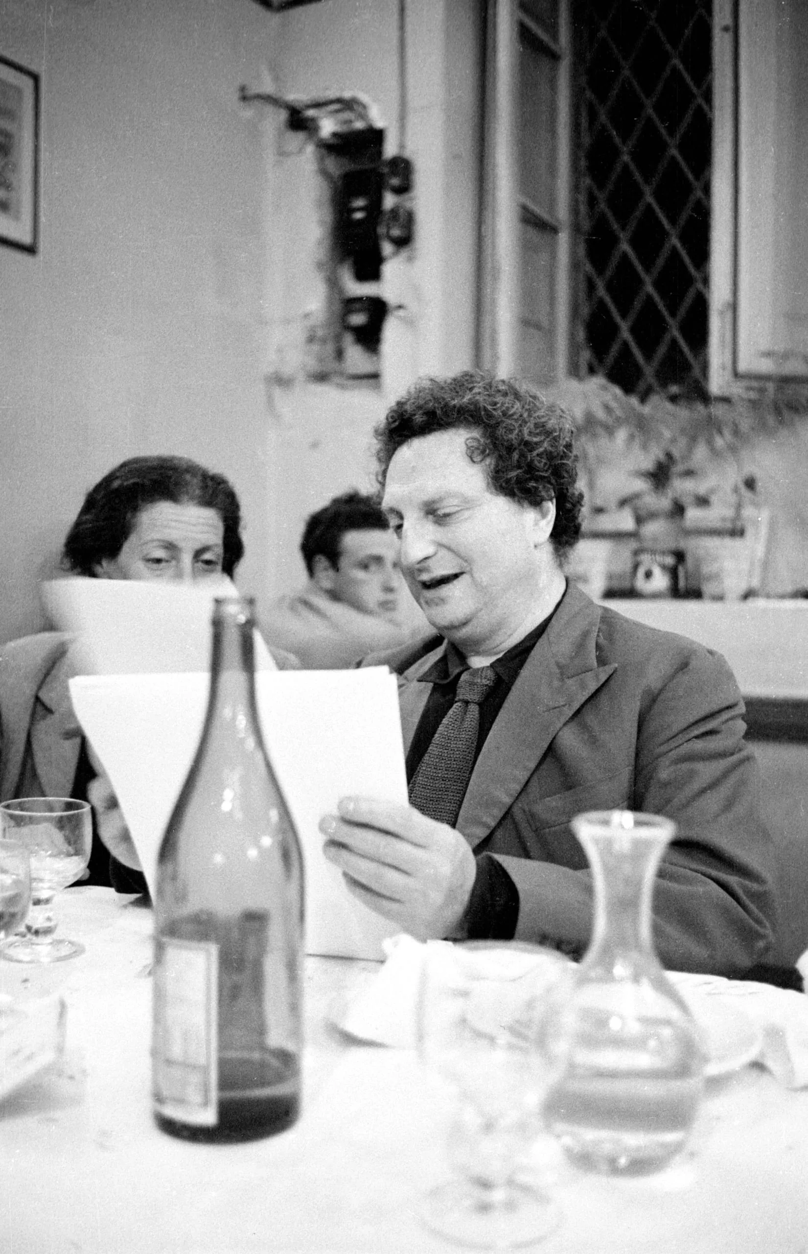 Black and white photograph of a curly-haired man at a restaurant table reading a sheet of paper, with a wine bottle and carafe in the foreground and two other diners behind him