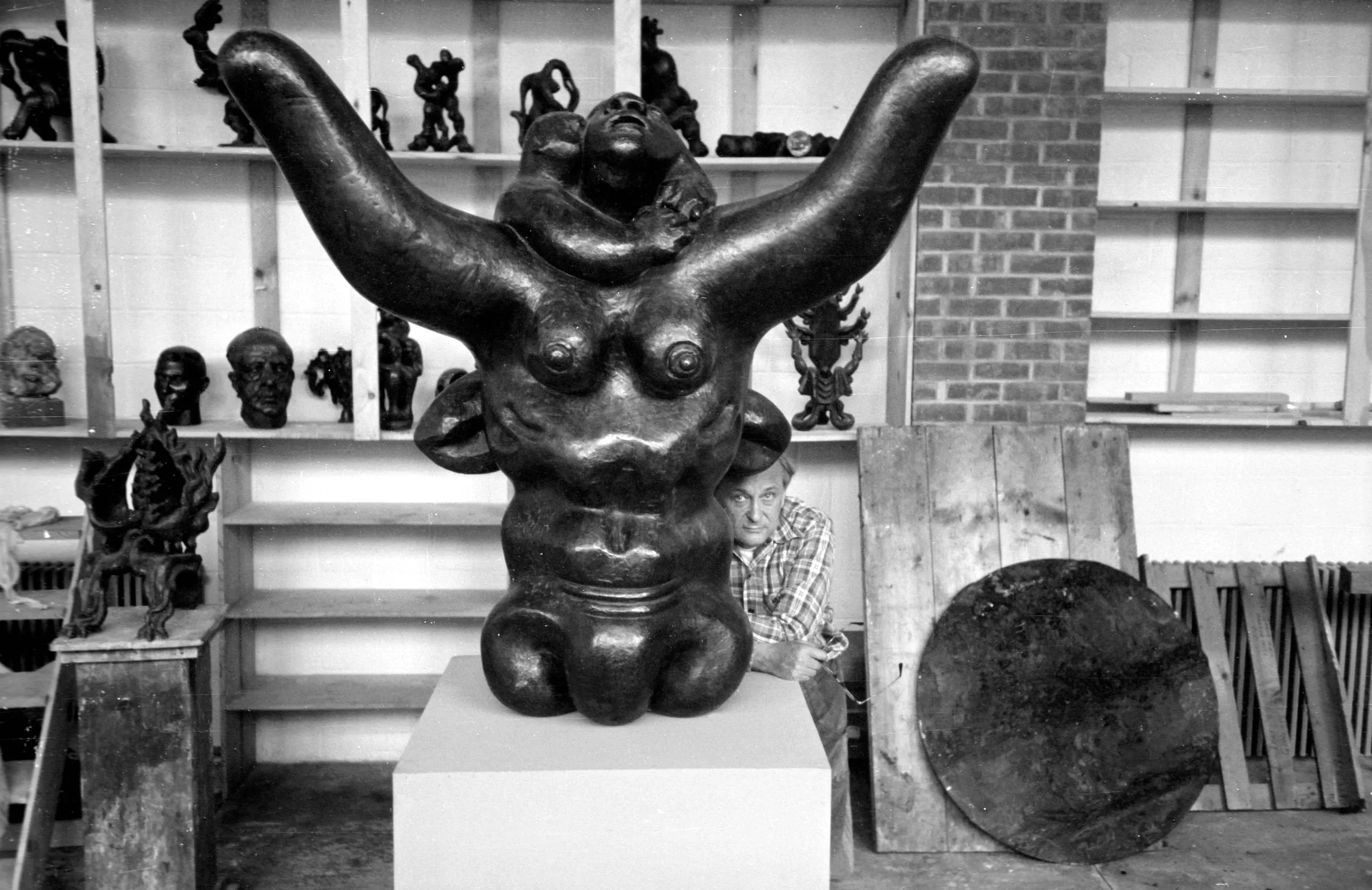 Black and white photograph of a large dark bronze-finished sculpture of an abstracted female torso with arms raised in a wide arc, displayed on a white pedestal in an artist's studio