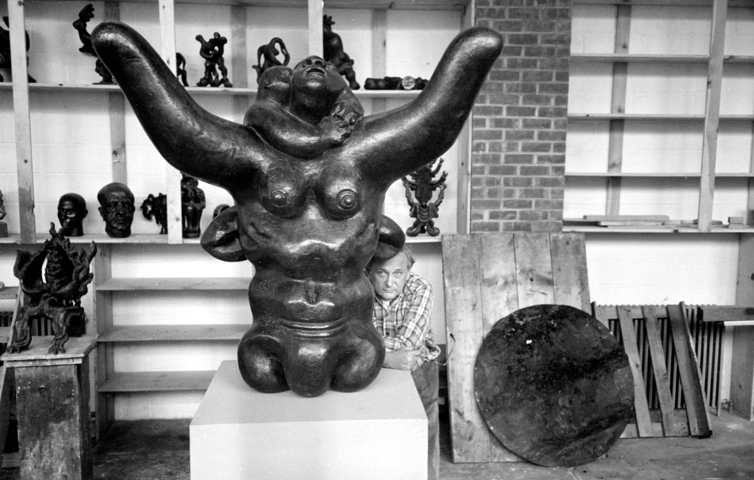 Black and white photograph of a large dark bronze sculpture of a voluminous female figure with arms raised wide, on a white pedestal in an artist's studio, with a man visible behind it
