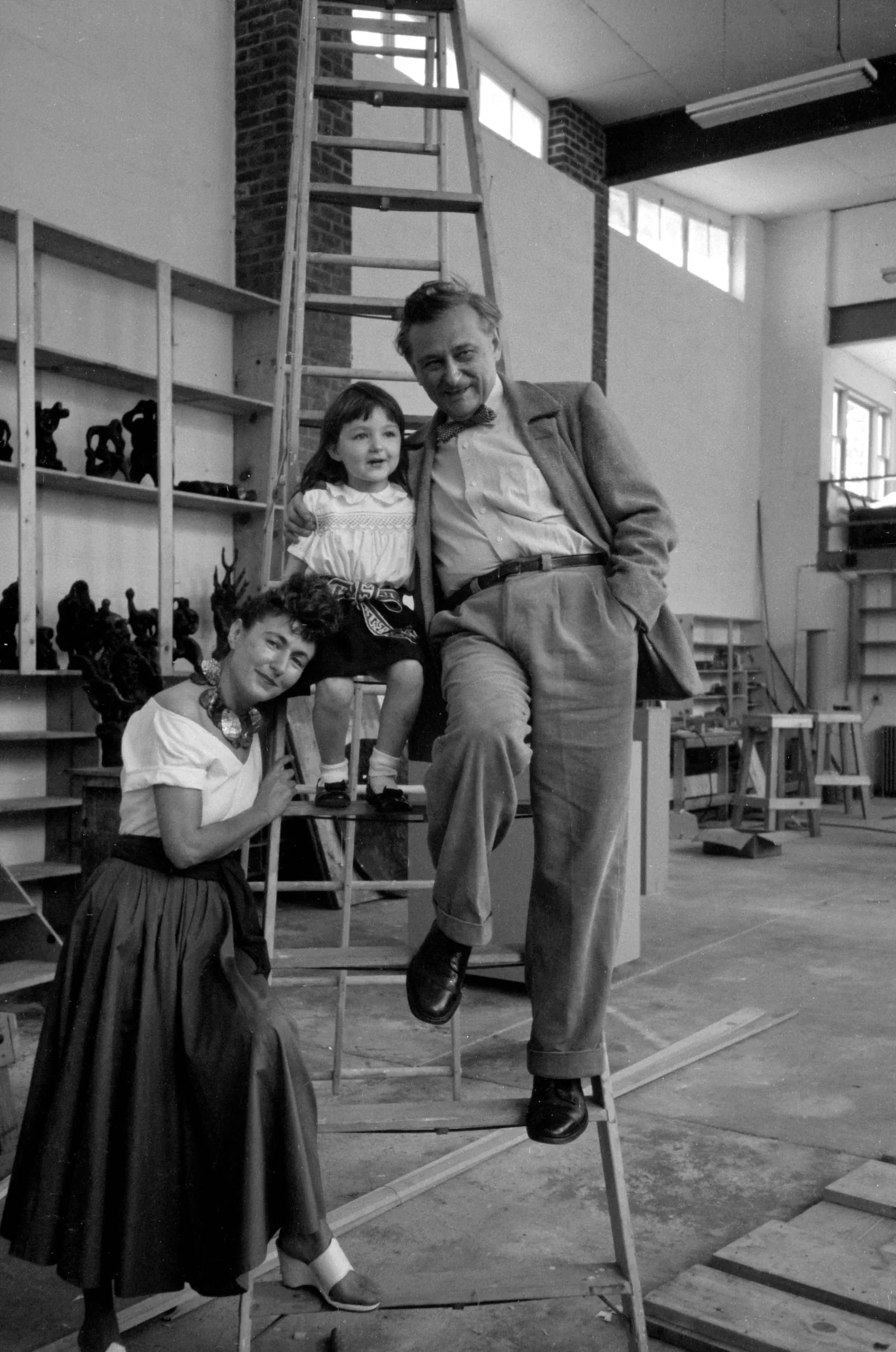 Black and white photograph of a woman, young child, and man posed together on and around a tall wooden ladder inside a high-ceilinged artist's studio