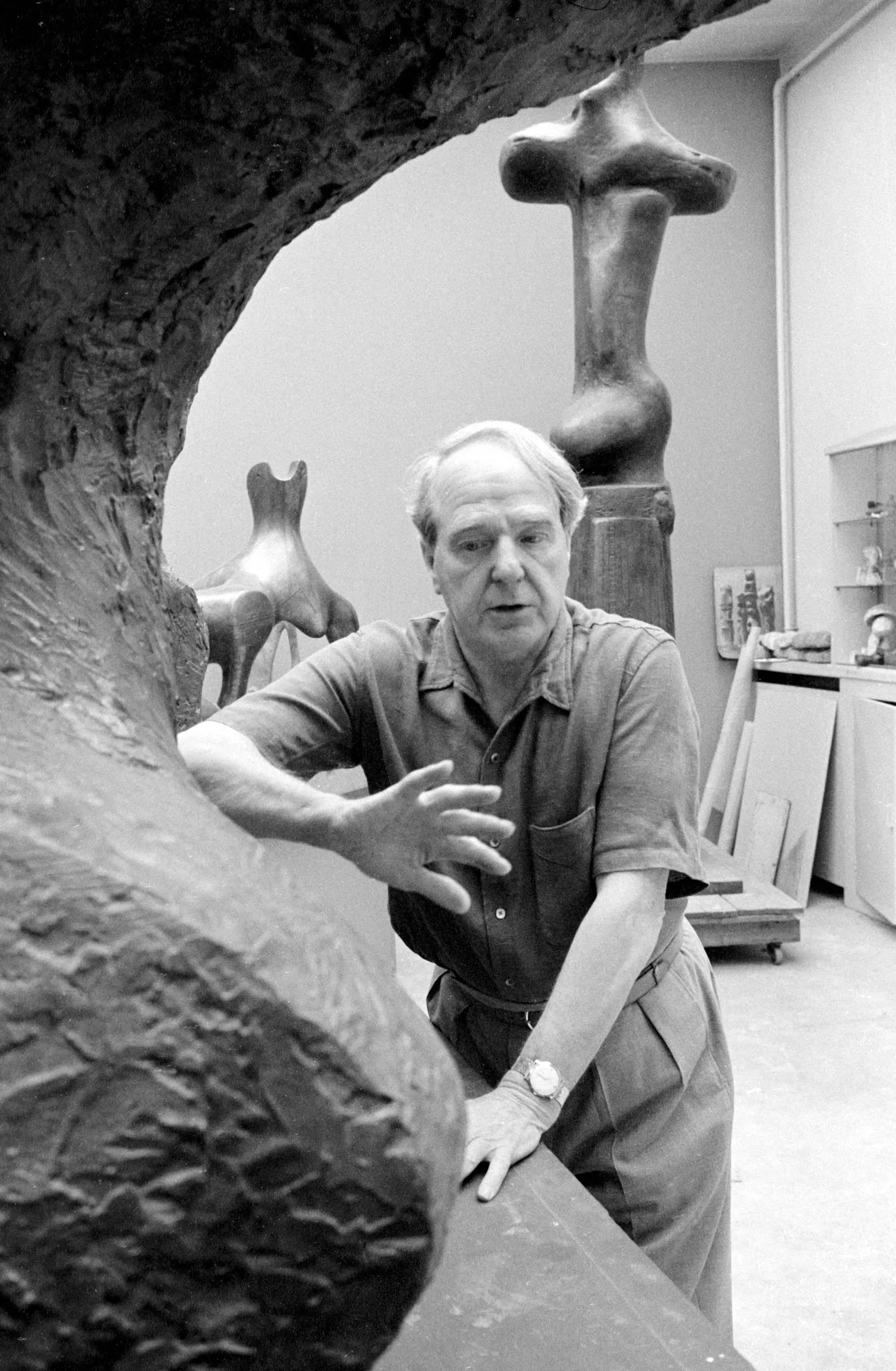 Black and white photograph of a man in a polo shirt leaning over a large, rough-textured abstract sculpture in a studio, with two smaller bronze sculptures visible behind him