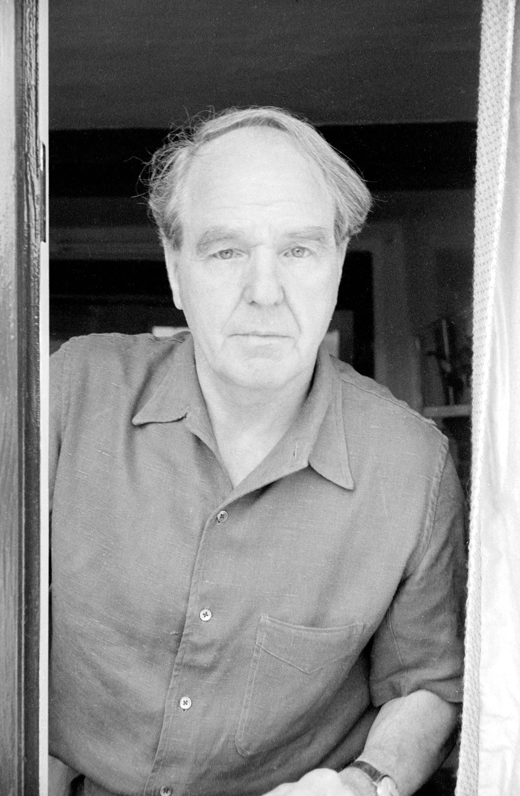Black and white portrait photograph, white man in his fifties or sixties standing in a doorway, wearing a button-down shirt, looking directly at the camera