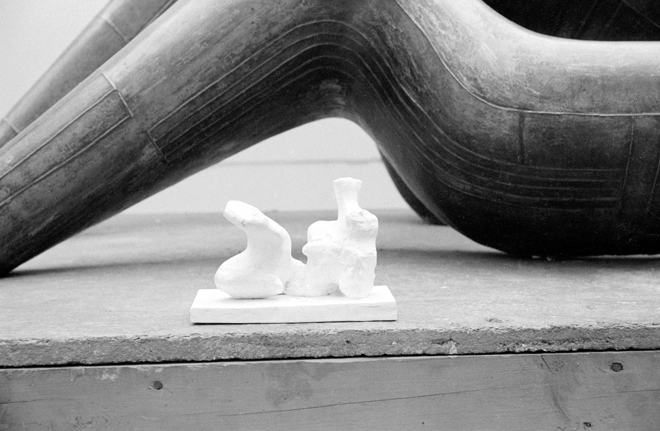 Black and white photograph of a small white plaster maquette with two abstract organic forms on a rectangular base, set against the curved, grooved limb of a large dark metal sculpture