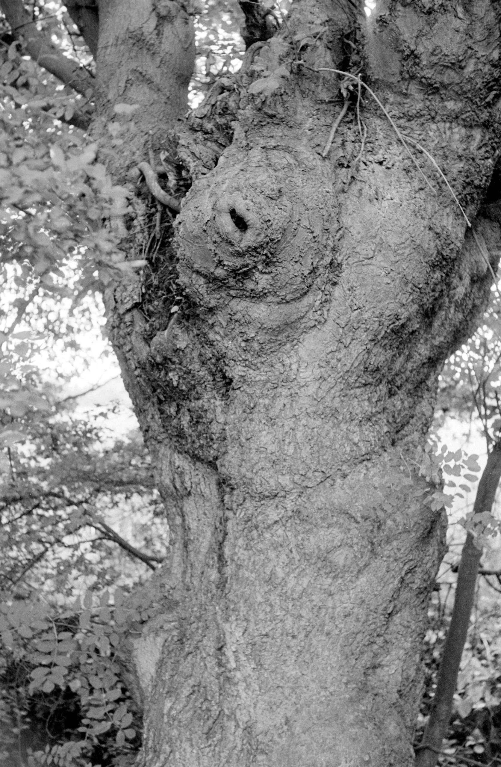 Black and white photograph of a large tree trunk with deeply textured bark and a prominent burl with a dark hollow at its center, surrounded by out-of-focus foliage