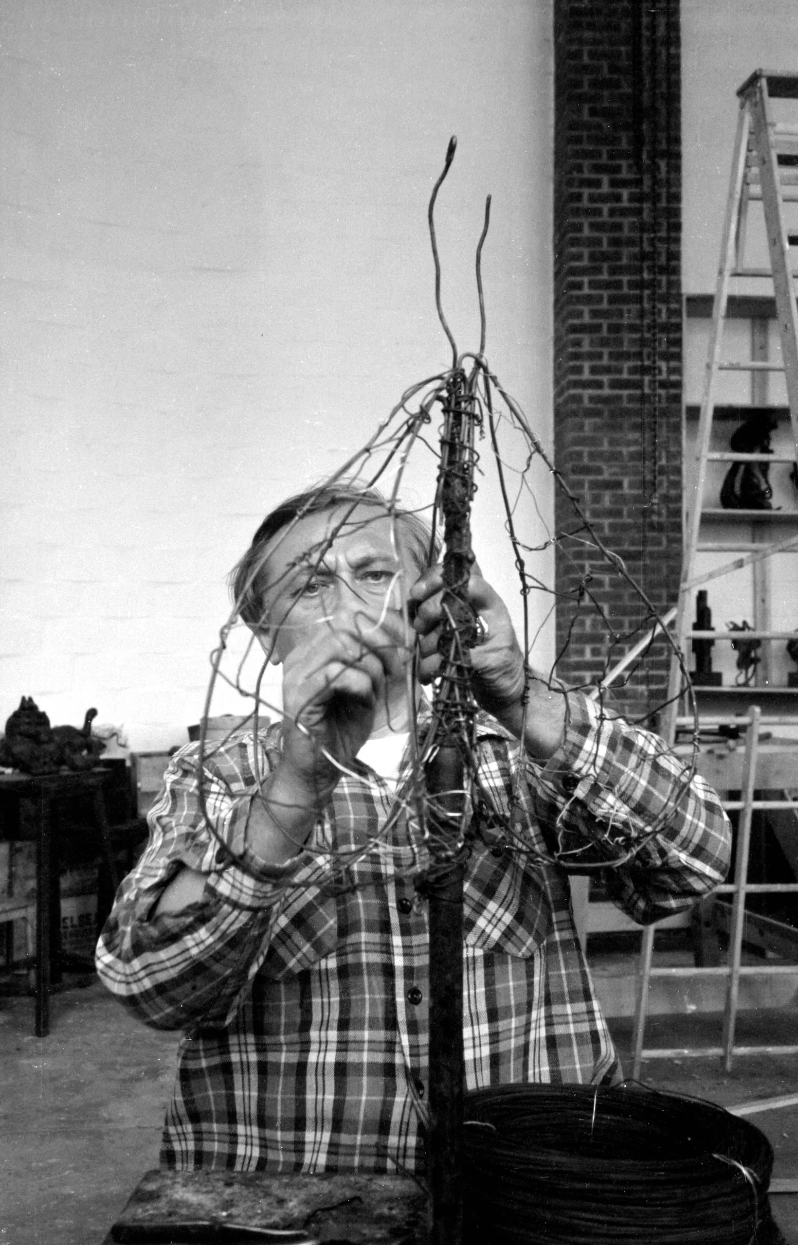 Black and white photograph of a man in a plaid shirt handling a tangle of wire and bare twigs in a studio, a coil of wire on the surface before him